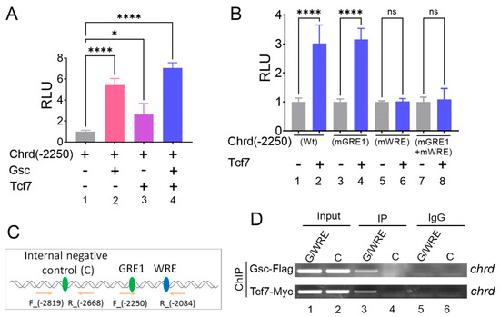 Figure 5. Tcf7 binds to WRE to activate chrd transcription. (A) Relative luciferase activity of chrd(-2250) promoter constructs with Gsc and Tcf7. (B) Relative luciferase activity of chrd(-2250)mGRE1 and chrd(-2250)mWRE constructs with Tcf7. (C) Schematic representation of designing the ChIP-PCR primer for GRE, WRE, and the internal negative control. (D) Chromatin immunoprecipitation (ChIP) assay was performed to test the occupancy of Gsc-Flag and Tcf7-Myc to GRE/WRE within the promoter region of chrd. * p ≤ 0.1, **** p ≤ 0.0001, and n.s. denotes nonsignificant values.