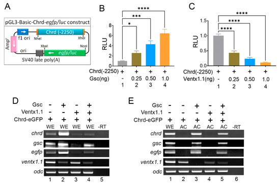 Figure 1. Ectopic expression of Gsc and Ventx1.1 differentially regulates the dorsal mesoderm (organizer) gene expression during gastrula. (A) The cloned chrd(-2250) promoter mapped into Pgl3 luc/eGFP vector. (B,C) The Xenopus embryos were injected with Gsc (B) and Ventx1.1 (C) (1 ng/embryo) at the one-cell stage. The reporter assay was performed at stage 11 in whole embryos (WEs). (C,D) To examine the endogenous expression, embryos were co-injected with Gsc and Ventx1.1 (1 ng/embryo) at the one-cell stage. RT-PCR was performed at stage 11 in Wes (D) and ACs (E). -RT referred to control reaction without reverse transcriptase.