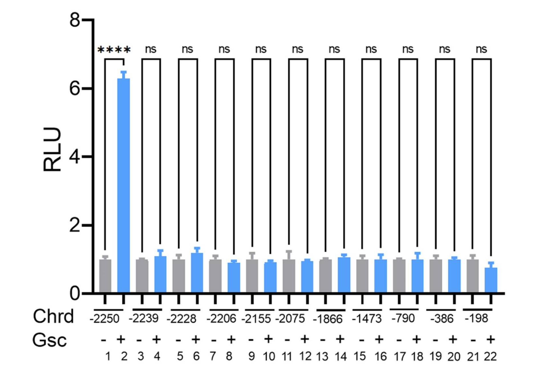 Figure S1. Serially deleted chrd promoter constructs injected with and without gsc mRNA at the one-cell stage. The relative luciferase activity was measured at stage 11.