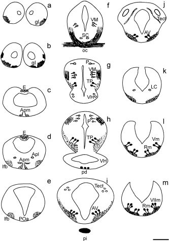 Figure 3. Diagrams of coronal sections from rostral to caudal (a–m) through the brain of a Xenopus larva at stage 45, showing darkly (solid) and lightly (open) stained cell bodies and fibers (lines and small dots). For abbreviations , see list. Scale bar = 100 μm.