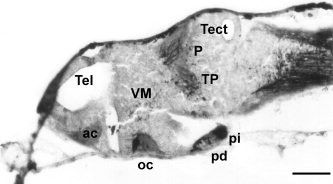 Figure 4. Sagittal to slightly oblique sections through the brain of a Xenopus larva at stage 45, showing immunoreactive cell bodies and fiber tracts. Note that presence of α-MSH in the optic chiasm is confined to the rostral edge. For other abbreviations , see list. Scale bar = 100 μm.