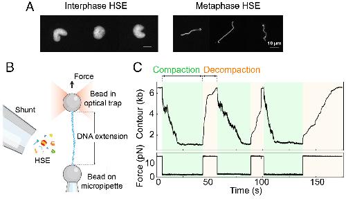 Fig.1. Assay using Xenopus egg extracts and optical tweezers to monitor compaction of a single DNA. (A) Xenopus sperm nuclei were added to high-speed extract (HSE) arrested in either interphase or metaphase. Sperm nuclei decondensed in interphase HSE to form rounded clusters of sperm chromosomes, whereas single mitotic chromosomes were visible in metaphase extracts. (B) Optical tweezer setup in which a linear DNA tether is coupled to two beads; one bead is attached to a micropipette and the other positioned in an optical trap. (C) Example trace showing DNA contour in base pairs and force exerted on the trapped bead over time. Alternating between low (1.5 pN) and high (15 pN) force after introduction of HSE results in rapid cycles of compaction and decompaction.