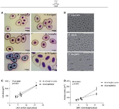 Figure 2. Scaling of cells and nuclei in adult pipid frog species (A) Images of erythrocytes from 5 adult pipid frog species of varying ploidies. See Figure S2A for details about species, including DNA content. Scale bars, 20 μm. (B) Images of adult epithelial cells from X. tropicalis, X. laevis, and X. longipes. Scale bars, 50 μm. (C) Average cell cross-sectional area in adult erythrocytes and epithelia as a function of genome size for each frog species. Five pipid frog species are plotted for erythrocytes; X. tropicalis, X. laevis, and X. longipes are plotted for epithelial cells. R2 ≥ 0.9980 for both erythrocytes and epithelia. See Figures S2B and S2C for distributions and Figure S3C for correlation and slope coefficients of each trend line. (D) Average nucleus cross-sectional area in adult erythrocytes and epithelia as a function of genome size for each frog species. Five pipid frog species are plotted for erythrocytes; X. tropicalis, X. laevis, and X. longipes are plotted for epithelial cells. R2 ≥ 0.9852 for both erythrocytes and epithelia. See Figures S2D and S2E for distributions and Figure S3F for correlation and slope coefficients of each trend line. For plots in (C) and (D), error bars indicate ±SD. |