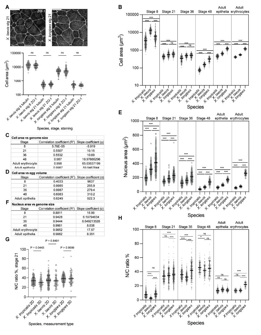 Figure S3. Measurement of cells, nuclei and N/C ratios in Xenopus embryos Related to Figures 2 and 3 (A)Comparison of ZO-1 (Zonula Occludens, tight junction) and tubulin staining in X. laevis and X. longipes embryos to measure cross-sectional area of cells shows that they produce statistically indistinguishable data. Scale bar, 15 µm. (B)Cross-sectional area of cells from X. laevis, X. tropicalis, and X. longipes embryos and adults measured using tubulin staining. (C)Correlation and slope coefficients of cell area vs genome size from linear trendlines in Fig. 3D. Correlation coefficients for linear trendlines (R2) were calculated from the Pearson’s Correlation Coefficient (R). (D)Correlation and slope coefficients of cell area vs egg volume from linear trendlines in Fig. 3E. Correlation coefficients for linear trendlines (R2) were calculated from the Pearson’s Correlation Coefficient (R). (E)Cross-sectional area of nuclei from X. laevis, X. tropicalis, and X. longipes embryos and adults. (F)Correlation and slope coefficients of nucleus area vs genome size from linear trendlines in Fig. 3C. Slope coefficients were statistically similar between stage 21 and 36 (p=0.6134) and between stage 48 and adult epithelia (p=0.2344). (G)Comparison of Nuclear/Cytoplasmic (N/C) volume ratios calculated from 2dimensional (2D) cross-sectional area measurements vs. 3-dimensional (3D) reconstructions of confocal Z-stacks in stage 21 X. tropicalis, X. laevis, and X. longipes embryos. n≥50 skin epithelial cells or nuclei from ≥3 embryos from ≥3 separate clutches were measured per stage for each species. (H)N/C volume ratios in X. tropicalis, X. laevis, and X. longipes, embryos and adults, calculated from cross-sectional area measurements in 3B-C. For plots in A, B, and E, at stage 8, cells near the surface of the embryo from both animal and vegetal polls were measured. From stage 21-48, skin epithelial cells were measured. n≥100 cells or nuclei from ≥3 embryos or adults from ≥3 separate clutches were measured per stage for each species. For all plots, thick line in the middle of each set of points=mean. error bars= +/- std dev. ***p<0.001, *p<0.05, and ns= not significant, determined by two-tailed t-test. |