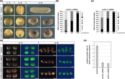 Figure 2. Phenotypes of dorsally ccl19.L and ccl21.L mRNA-injected embryos and Keller sandwich explants. (a) Phenotypes of embryos when injected with ccl19.L and ccl21.L mRNA into two dorsal blastomeres at the four-cell stage. The developmental stages are indicated in upper panels. Vegetal view (st. 12), dorsal view (st. 18), lateral view (st. 28). In the stage 28 images of mRNA-injected embryos, which had very short and bending anterior–posterior axes, the left panels show a representative example of the weak phenotypes with head structures, and the right panels show a representative example of the severe phenotype without head structures. Bars, 0.5 mm. (b and c) The appearance rates of phenotypes in Figure 2a. Normal phenotype (light gray), weak phenotype (dark gray), and severe phenotype (black) are shown. The quantity of injected mRNA is indicated at the bottom of the graph. (b) ccl19.L mRNA-injected embryos. Lane 1: n = 58; normal (41.4%), weak (53.4%), and severe (5.2%). Lane 2: n = 58; normal (0%), weak (46.6%), and severe (53.4%). Lane 3: n = 60; normal (0%), weak (10.0%), and severe (90.0%). (c) ccl21.L mRNA-injected embryos. Lane 1: n = 58; normal (31.0%), weak (56.9%), and severe (12.1%). Lane 2: n = 58; normal (0%), weak (34.5%), and severe (65.5%). Lane 3: n = 57; normal (0%), weak (12.1%), and severe (87.9%). (d) Keller sandwich explants of embryos injected dorsally with ccl19.L or ccl21.L mRNA. Upper panels indicate the stages of time-control embryos. Right images indicate fluorescent images of the explants. Overexpression of ccl19.L and ccl21.L mRNA inhibited the convergent extension cell movements. Bars, 0.5 mm. (e) Length-to-width ratio of Keller sandwich explants (st. 25). The length of the bending parts of the explants was measured along the axial elongation. The longest axis of each explant was divided by its widest perpendicular aspect except for the epidermal ectoderm region. Eight explants were measured in each category. |