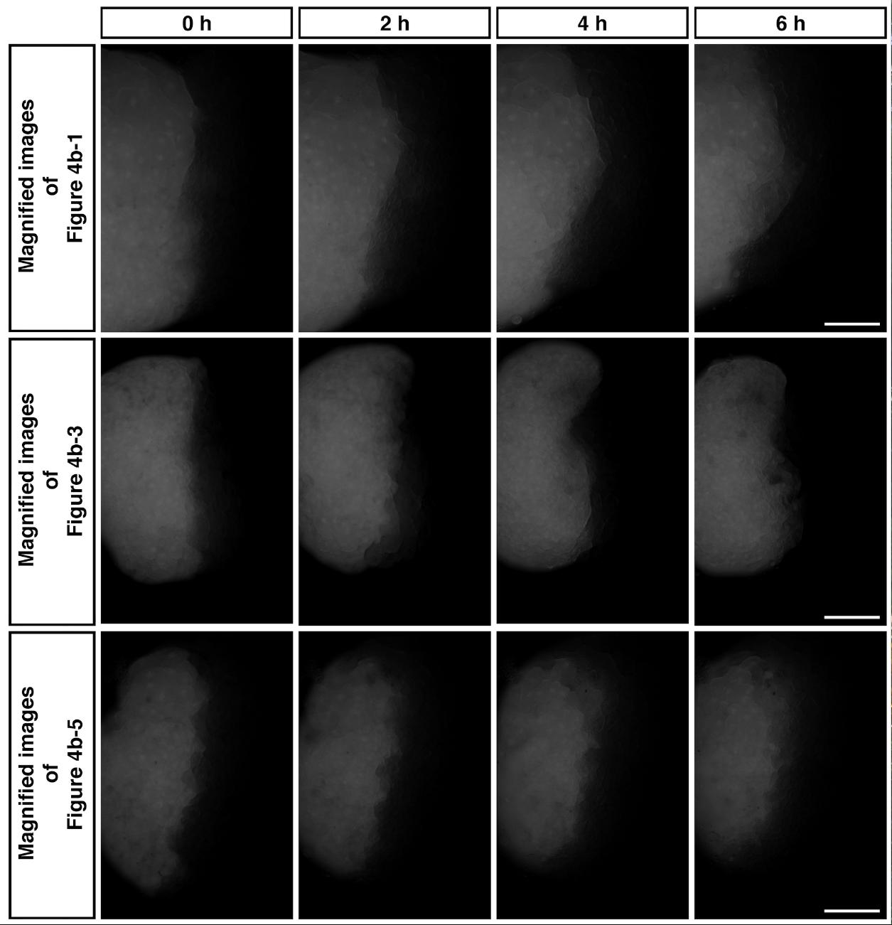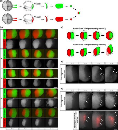 Highly magnified images of the red labeled ventral mesodermal sector of Figure 4b-1, b-3, b-5 are indicated in the top, center, and bottom panels, respectively. The elapsed time is indicated at the top. Bars, 0.5 mm. |
