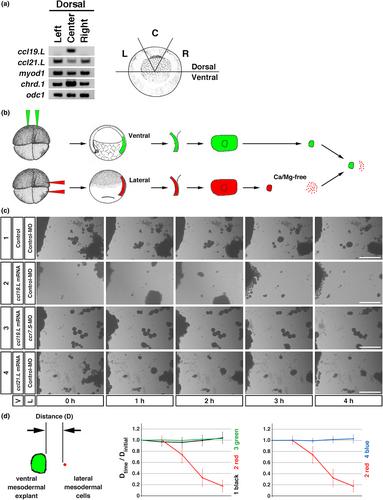 Figure 3. Analysis of chemotactic cell migration. (a) Reverse transcription-PCR (RT-PCR) analysis of spatial expression patterns of ccl19.L and ccl21.L in dorsal halves of gastrulae (st. 10). Dissections were performed as shown on the right. L, left; C, center; R, right. chrd.1 or myod1 was used as an axial or a paraxial marker gene, respectively. odc1 was used as an internal control. (b) Schematics of the protocol of the cell migration assay. ccl19.L (1000 pg/blastomere) or ccl21.L (500 pg/blastomere) mRNA was co-injected into two ventral blastomeres of four-cell embryos with green fluorescent tracer. Control-MO (20 ng/blastomere) or ccr7.S-MO (20 ng/blastomere) was co-injected into two lateral blastomeres of four-cell embryos with red fluorescent tracer. The ventral mesodermal sectors were dissected from stage 10 embryos. Epithelium was removed to use as the ventral mesodermal explants. The lateral mesodermal sectors were dissected from stage 10 embryos and dissociated in a calcium- and magnesium-free solution. The dissociated lateral mesodermal cells were placed approximately 0.5–1.0 mm from the ventral mesodermal explants on a fibronectin-coated cover glass. (c) Migration of scattered lateral mesodermal cells. The ventral mesodermal explants were placed on the left side. Injected reagents into the ventral and lateral mesodermal sectors are indicated on the left. V, ventral mesoderm; L, lateral mesoderm. Each combination of ventral mesodermal explant and lateral mesodermal cells is numbered. The elapsed time is indicated at the bottom. Bars, 0.5 mm. (d) Schematics of the experiments are shown on the left. The graph of the ratio (Distancetime/Distanceinitial) of lateral mesodermal cell migration (n = 10) is shown on the right. The ratio of the distance between ventral mesodermal explants and lateral mesodermal cells was measured hourly. In the numbers in Figure 3c, the average ratio is shown by the black line for number 1, the red line for number 2, the green line for number 3, and the blue line for number 4. |