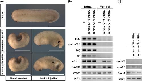 Figure 7. Effects of human ccl19 and ccl21 on early Xenopus development. (a) Phenotypes of embryos injected with human ccl19 and ccl21 mRNA (500 pg/blastomere) (st. 28). All dorsally injected embryos showed gastrulation defects (n = 43, human ccl19 injection, and n = 44, human ccl21.L injection). All ventrally injected embryos showed ventral gastrulation defects with small secondary axis-like structures (n = 44, human ccl19 injection, and n = 43, human ccl21.L injection). Arrowheads indicate small secondary axis-like structures. Bars, 1.0 mm. (b and c) RT-PCR analysis of the dorsal or ventral sectors (st. 10) (b) and the animal caps (st. 9.5) (c) of embryos injected with human ccl19 and ccl21 mRNA. |