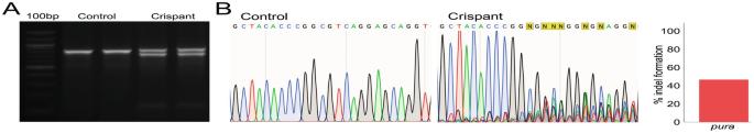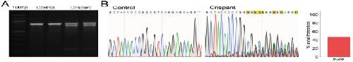 Genotype analysis of F0 mosaic tadpoles. The target locus is amplified from genomic DNA preparations of injected (crispant) and uninjected (control) tadpoles. Amplicons are digested with T7 Endonuclease I, which reveals a second band unique to crispant tadpoles that correspond to the location of the CRISPR target site (A). Sanger sequencing is used to confirm the presence of indels in these crispant samples. Analysis of the Sanger sequencing trace files by Synthego ICE revealed the editing efficiency of the target domain is around 50% (B)