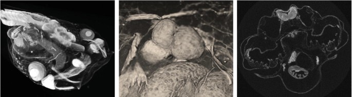 Detailed structural differences are examined in Xenopus tadpoles using high-resolution Micro Computed Tomography. The imaged volumes show a whole tadpole with a 3D reconstruction of the cardiovascular system and gut visualized using TXM3DViewer (Carl Zeiss Microscopy) that can be exported as cross-section high-resolution TIFF image files