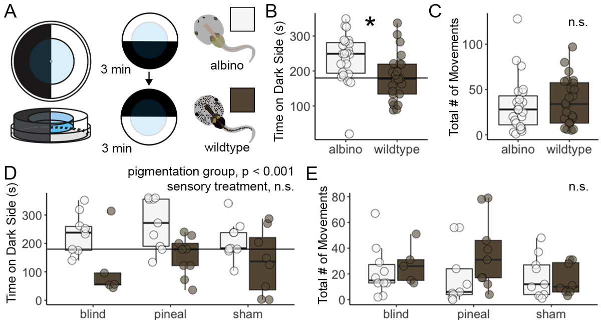 (A) Tadpole preferences for dark or light environments were tested in a simple chamber made of two petri dishes. The time spent on the dark side was recorded for three minutes before and after the outer chamber was rotated. (B) Albino tadpoles (white) spent more time in the darker environment compared to wild-type tadpoles (brown) (ANOVA, F(1) = 8.124, p = 0.007). (C) The total number of movements did not differ between groups. (D) Tadpole environmental preferences remained consistent despite being blind, having their pineal gland removed, or experiencing a control sham operation (2-way ANOVA, pigmentation group: F(1) = 16.448, p < 0.001; sensory treatment and their interaction was not significant). (E) The total number of movements did not differ between pigmentation groups nor sensory treatments.