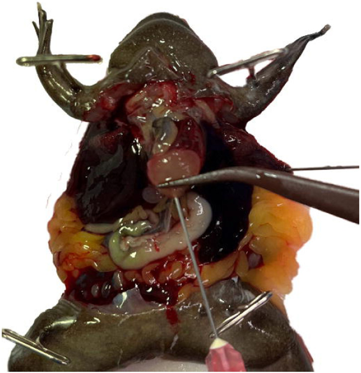 UNLABELLED: Xenopus has been a powerful model organism for understanding vertebrate development and disease for over a hundred years. Here we define a rapid blood perfusion protocol in Xenopus aimed at a consistent and drastic reduction of blood across tissues. Perfusion is done by inserting a needle directly into the ventricle and pumping heparin in PBS through the vascular system. The whole procedure should take about 10 minutes per frog. Blood is dominated by a few highly abundant proteins and cell types which create numerous issues by masking most other molecules and cell types of interest. Reproducible characterization of adult Xenopus tissues with quantitative proteomics and single cell transcriptomics will gain from applying this protocol prior to organ dissections defined in companion papers. The procedure is aimed at standardization of practice across the animals of different gender, age and Xenopus species, specifically X.laevis and X.tropicalis . SUMMARY: An effective rapid blood perfusion protocol to prepare tissue samples for transcriptomics and proteomics studies.