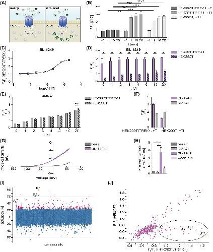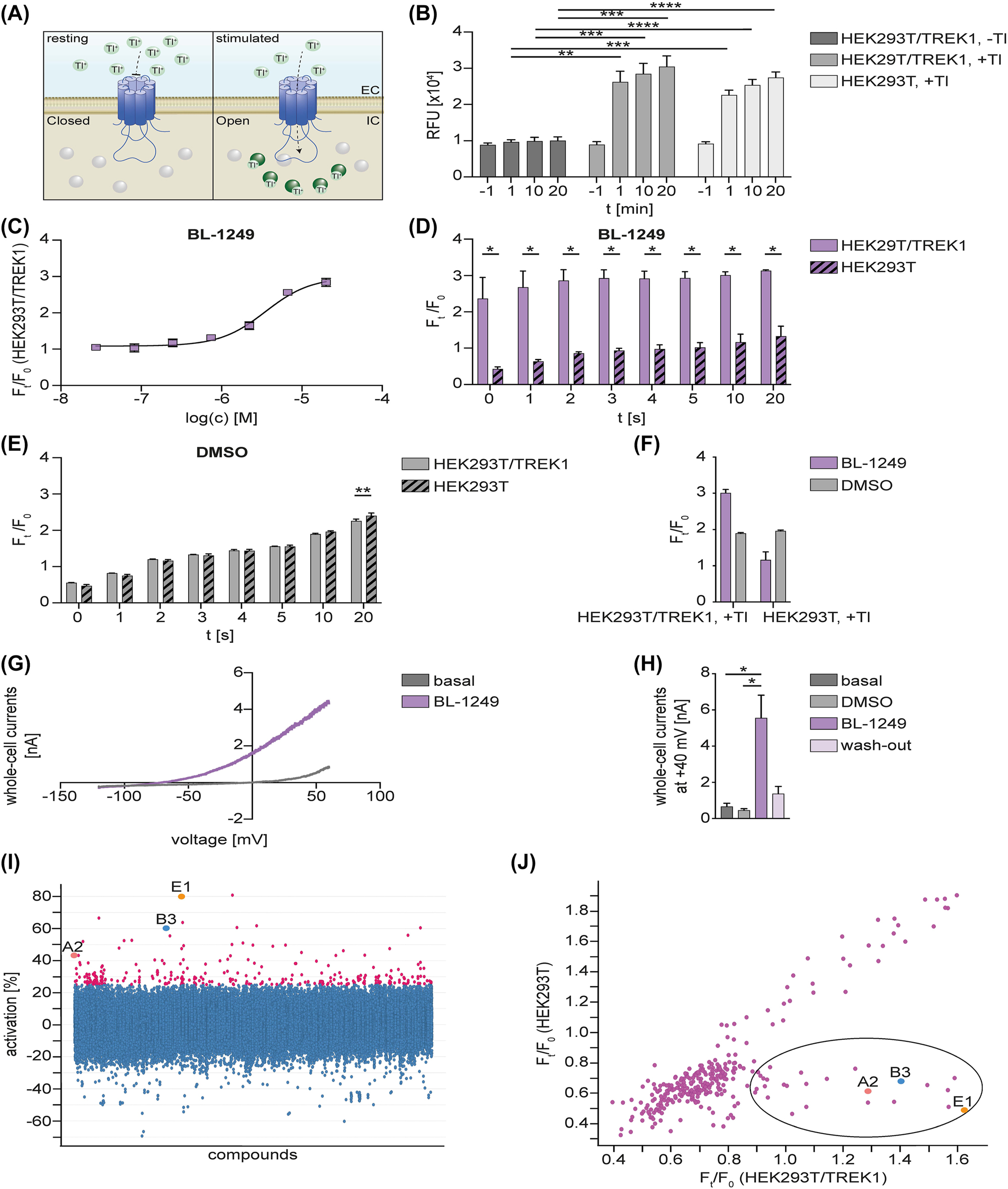 Figure 1: Adaptation of FluxOR™ potassium ion channel assay and its application for identification of new TREK1 channel activators. A: Schematic overview of assay principle. B: Increase in fluorescence in FluxOR™ dye loaded DMSO-treated HEK293T/TREK1 and HEK293T cells due to addition of Tl+ as a surrogate for potassium (Two-way ANOVA with Tukey’s multiple comparisons test, n = 4 for all groups). C: HEK293T/TREK1 cells were incubated with increasing concentrations of BL-1249 (logarithmic concentrations are depicted in [M]) for 20 min at RT, followed by fluorescence detection using FluxOR™ potassium ion channel assay. EC50 = 3.51 µM (n = 2). D: FluxOR™ dye loaded cells were incubated with BL-1249 for 20 min at RT before addition of Tl+. Enhancement of fluorescence response in HEK293T/TREK1 cells due to activation of TREK1 using 200 µM of BL-1249. No enhancement of fluorescence response in HEK293T cells (Two-way ANOVA with Šidák’s multiple comparisons test, n = 3 for both groups). E: Increase in fluorescence in FluxOR™ dye loaded HEK293T/TREK1 and HEK293T cells after addition of 1% DMSO representing unspecific Tl+ transport (Two-way ANOVA with Šidák’s multiple comparisons test, n = 3 for both groups). F: HEK293T/TREK1 and HEK293T cells were incubated with 200 µM BL-1249 or 1% DMSO for 20 min at RT, followed by fluorescence detection using FluxOR™ potassium ion channel assay (Two-way ANOVA with Tukey’s multiple comparisons test, n = 3 for both groups, p > 0.05). G: Representative traces of wt TREK1 K2P channel currents from whole-cell experiments using HEK293T cells. Voltage ramps were measured between −100 mV and +60 mV and analysed at +40 mV. Measurements were performed in control solution (‘basal’, pH 7.3) and in the presence of 125 µM BL-1249. H: Summary plot showing TREK1 K2P channel currents from measurements as in G, at basal conditions (n = 6), in the presence of 0.25% DMSO (n = 3), in the presence of 125 µM BL-1249 (n = 6; FI = 9.29 ± 2.01) and after wash-out of BL-1249 (n = 4). TREK1 currents were significantly increased by BL-1249 (Kruskal–Wallis test including Dunn´s post-hoc test, p = 0.0135 for basal vs. BL-1249, p = 0.0133 for DMSO vs. BL-1249, p > 0.05 for remaining data). I: Calculated TREK1 activation in % of screened compounds normalized to TREK1 activation by BL-1249 (100% activation) and DMSO (0% activation). Substances with TREK1 activation of ≥25% are coloured in magenta. J: Hit confirmation of selected hits in HEK293T/TREK1 and HEK293T cells, tested at 10 µM in triplicates. Data show average values of signal increase ratios. Compounds with observed activation in HEK293T/TREK1 cells and no activation in HEK293T cells are encircled in black. Abbreviations: DMSO, dimethyl sulfoxide; EC, extracellular; EC50, half maximal effective concentration; F0, minimal fluorescence (arbitrary units); Ft, steady-state terminal fluorescence (arbitrary units); Ft/F0, signal increase ratio; HEK293T, HEK293T cells; HEK293T/TREK1, stably TREK1-transfected HEK293T cells; IC, intracellular; min, minutes; K2P channel, two-pore domain potassium channel; mV, millivolt; nA, nanoampere; RFU, relative fluorescence unit; RT, room temperature; s, seconds; SEM, standard error of the mean; t, time; Tl, thallium; TREK1, TWIK-related potassium channel 1; wt, wild type. |