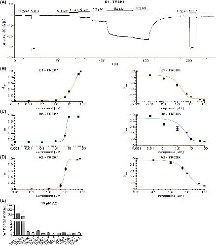 Figure 2: Electrophysiological compound validation of TREK1 activating compounds. A: Representative measurement of wt TREK1 K2P channels from inside-out patches of Xenopus laevis oocytes showing the activation by increasing concentrations of the indicated compound E1, recorded at a constant potential of −80 mV in symmetrical K+ at pH 7.4. Patch integrity was tested by application of 1 mM TPenA showing almost full block of TREK1 baseline current. Channel opening by intracellular acidification (pHi 5.0) was measured as reference activation. B–D: Dose-response curves from measurements as in A for TREK1 (left panels) and TRESK K2P channels (right panels) showing the concentration-dependent activation of TREK1 and inhibition of TRESK (mean ± SEM) respectively, with the compounds E1 (B), B3 (C) and A2 (D) Compounds were chosen due to the ratio of (i) fold current increase (FI), (ii) the difference between EC50 and CC50, (iii) as well as their interaction with TRESK K2P channels (IC50). E: Modulation of K2P channel currents by 10 µM A2, analysed at −80 mV (One-way ANOVA p-values: TREK1 vs. TREK2 0.0202, TREK1 vs. TRAAK 0.0004, TREK1 vs. TALK-1 0.0002, TREK1 vs. TALK-2 <0.0001, TREK1 vs. TASK-1 0.0003, TREK1 vs. TASK-2 0.0004, TREK1 vs. TASK-3 0.0003, TREK1 vs. THIK-1 0.0002, TREK1 vs. THIK-2 0.0002, TREK1 vs. TRESK <0.0001, TREK1 vs. TWIK-1 0.0003, TREK1 vs. TWIK-2 0.0004). Abbreviations: CC50, 50% cytotoxic concentration; EC50, half maximal effective concentration; FI, fold increase; I, current; IC50, half maximal inhibitory concentration; Imax, maximum current; K2P channel, two-pore domain potassium channel; mV, millivolt; nA, nanoampere; pHi, intracellular pH; s, seconds; SEM, standard error of the mean; t, time; TPenA, Tetra-pentyl-ammonium; TREK1, TWIK-related potassium channel 1; TRESK, TWIK-related spinal cord potassium channel; wt, wild type. |