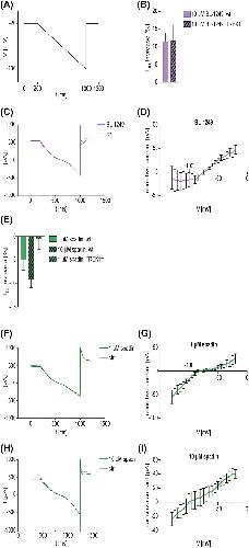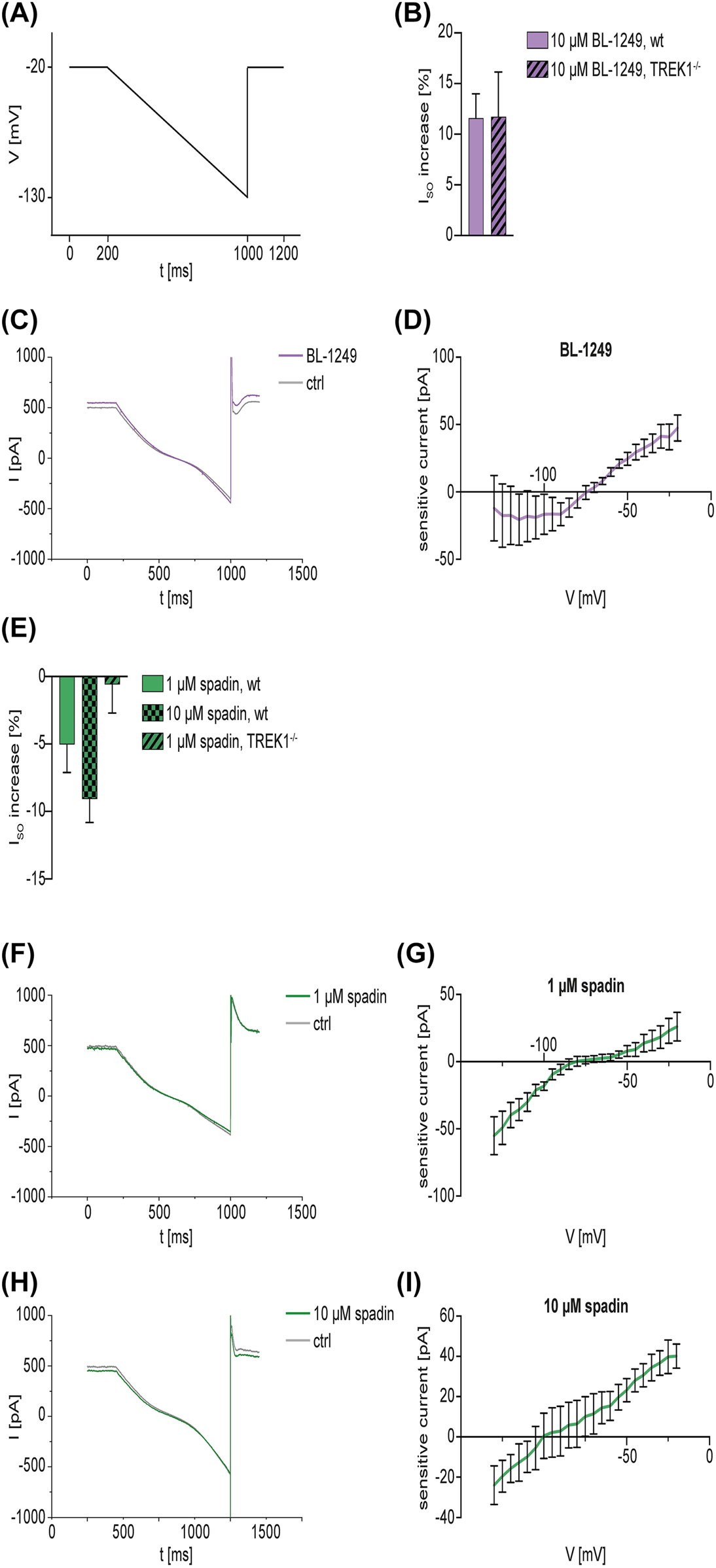 Figure 4: Whole-cell voltage-clamp recordings in VB neurons of wt C57BL/6J and TREK1−/− mice after treatment with the TREK1 activator BL-1249 or the TREK1 blocker spadin. A: Ramp protocol used for voltage-clamp experiments. Cells were first held at −20 mV for 200 ms, then hyperpolarized to −130 mV over 800 ms, followed by another step at −20 mV for 200 ms. The ISO was measured before and after the substance was washed into the external bath solution and its increase [%] was calculated. Sensitive currents were calculated by graphically subtracting the currents before and after the substance was washed in. B: Effects of BL-1249 on the ISO in VB neurons of wt C57BL/6J and TREK1−/− mice. 10 µM of BL-1249 were applied (unpaired Mann-Whitney U test, n = 6 wt, n = 5 – TREK−/−, p > 0.05). C: Exemplary recording of a VB neuron in wt C57BL/6J mice before (grey trace) and after (violet trace) the application of 10 µM BL-1249. D: Mean sensitive currents of voltage-clamp recordings in VB neurons of wt C57BL/6 mice after treatment with 10 µM BL-1249 (reversal potential at −75 mV). E: Effect of spadin on the ISO in VB neurons of wt C57BL/6J and TREK1−/− mice. Concentrations of both 1 µM (in wt C57BL/6J and TREK1−/− mice) and 10 µM (in wt C57BL/6J mice) spadin were tested. Increases of ISO [%] are depicted (Kruskal–Wallis test with Dunn´s post-hoc test, n = 5 for all groups, p > 0.05). F, H: Exemplary recording of VB neurons in wt C57BL/6J mice before (grey trace) and after (green trace) the application of spadin (1 µM, F; 10 µM, H). G, I: Mean sensitive currents of voltage-clamp recordings in VB neurons of wt C57BL/6 mice after treatment with 1 µM (G, equilibrium potential at −80 mV) or 10 µM spadin (I, equilibrium potential at −100 mV), respectively. Abbreviations: Ctrl, control; DMSO, dimethyl sulfoxide; I, current; ISO, standing outward current; ms, milliseconds; mV, millivolt; pA, picoampere; s, seconds; SEM, standard error of the mean; t, time; TREK1, TWIK-related potassium channel 1; TREK1−/−, TREK1 knockout; V, voltage; VB, ventrobasal thalamic complex; wt, wild type. |