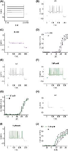 Figure 5: Whole-cell current-clamp experiments in murine VB neurons in wt C57BL/6J mice after treatment with TREK1 activator BL-1249 or the TREK1 blocker spadin. A: Step protocol used for current-clamp experiments. All experiments were performed at RMP (ranging from −60 to −70 mV). From the RMP, a current step protocol was applied with each step of the protocol increasing the current injected by +20 pA and lasting for 2500 ms. Injected currents ranged from −180 pA to +420 pA. B, C: Exemplary recording of a VB neuron before (B) and after the treatment with 10 µM BL-1249 (C). In both cases, a depolarizing current step of 260 pA was applied. D: Input-output curve of VB neurons in wt C57BL/6J mice before (grey trace) and after (violet trace) treatment with 10 µM BL-1249. The curve was generated by plotting the number of APs generated against the injected current (Mixed-effects analysis with Šidák correction, F (1, 8) = 0.6765, n = 5 for both groups, p > 0.05). E, F: Exemplary recording of a VB neuron before (E) and after (F) the treatment with 1 µM spadin. In both cases, a depolarizing current step of +320 pA was applied. G: Input-output curve of VB neurons in wt C57BL/6J mice before (grey trace) and after (green trace) application of 1 µM spadin (Mixed-effects analysis with Šidák correction, F (1, 6) = 0.07941, n = 4, p > 0.05). H, I: Exemplary recording of VB neurons before (H) and after (I) treatment with 10 µM spadin. In both cases, a depolarizing current step of +120 pA was applied. J: Input-output curve of VB neurons in wt C57BL/6J mice before and after application of 10 µM spadin (Mixed-effects analysis with Šidák correction, F (1, 8) = 2.538−5, n = 5, p > 0.05). Abbreviations: AP, action potential; ctrl, control; I, current; ms, milliseconds; mV, millivolt; ns, not significant; pA, picoampere; RMP, resting membrane potential; SEM, standard error of the mean; t, time; TREK1, TWIK-related potassium channel 1; V, voltage; VB, ventrobasal thalamic complex; wt, wild type. |