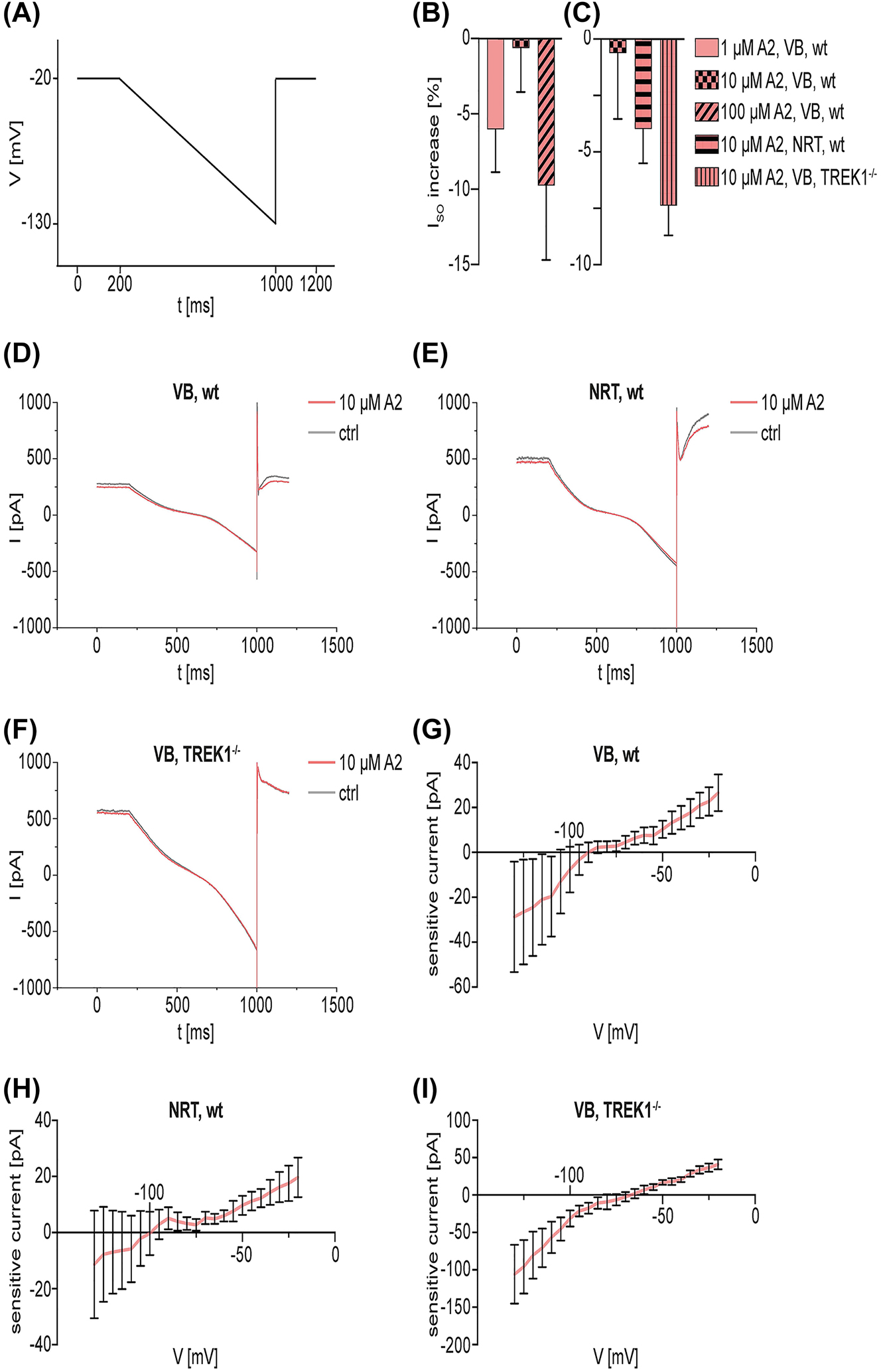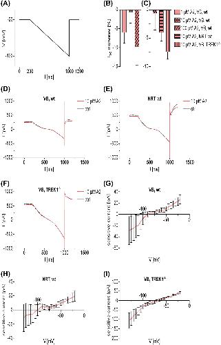 Figure 6: Whole-cell voltage-clamp recordings in murine VB and NRT neurons in wt C57BL/6J and TREK1−/− mice after treatment with the newly identified TREK1 activator A2. A: Ramp protocol used for voltage-clamp experiments. Cells were first held at −20 mV for 200 ms, then hyperpolarized to −130 mV over 800 ms, followed by another step at −20 mV for 200 ms. B: Effect of different A2 concentrations on the ISO in wt C57BL/6J mice. The ISO was measured before and after the TREK1 activator was washed into the external bath solution and its decrease [%] was calculated. A2 was tested in concentrations of 1, 10 and 100 µM (Kruskal–Wallis test including Dunn´s post-hoc test, n = 5–1 µM, n = 9–10 µM, n = 5–100 µM, p > 0.05). C: Measurements with 10 µM A2 in VB and NRT neurons in wt C57BL/6J mice and in VB neurons in TREK1−/− mice. The change of the ISO [%] is depicted (Kruskal–Wallis test including Dunn´s post-hoc test, n = 9 - VB neurons in wt C57BL/6J mice, n = 5 - NRT neurons in wt C57BL/6J mice, n = 4 - VB neurons in TREK1−/− mice, p > 0.05). D, E, F: Exemplary recordings of murine neurons before (grey trace) and after (red trace) the treatment with 10 µM A2. Measurements were performed in VB neurons (D) and NRT neurons (E) in wt C57BL/6J mice as well as in VB neurons in TREK1−/− mice (F). G, H, I: Mean sensitive currents of voltage-clamp recordings after treatment with 10 µM A2. Measurements were performed in wt VB (G) and NRT neurons (H) as well as in VB neurons in TREK1−/− mice (I). Sensitive currents were calculated by graphically subtracting the currents before and after the substance was washed in. Abbreviations: Ctrl, control; I, current; ISO, standing outward current; ms, milliseconds; mV, millivolt; NRT, thalamic reticular nucleus; pA, picoampere; SEM, standard error of the mean; t, time; TREK1, TWIK-related potassium channel 1; TREK1−/−, TREK1 knockout; V, voltage; VB, ventrobasal thalamic complex; wt, wild type. |