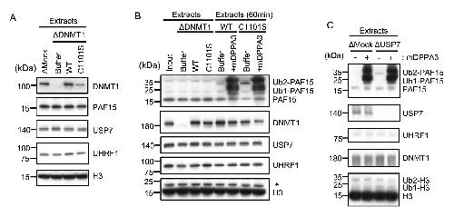 Qin, Usp7 and Uhrf1 control ubiquitination and stability of the maintenance DNA methyltransferase Dnmt1. 2011, Pubmed