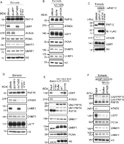 Figure 6—figure supplement 1. ATAD5 unloads PAF15Ub0 from chromatin.(A) Mock-, USP7-, ATAD5-, or USP7/ATAD5 co-depleted extracts were used in Figure 6A and analyzed by immunoblotting using the antibodies indicated. (B) rhATAD5-RFCs was added to ATAD5-depleted extracts. The extracts were used in Figure 6B and analyzed by immunoblotting using the antibodies indicated. (C) rPAF15 KRKR-3xFLAG was added to PAF15- or PAF15/ATAD5 co-depleted extracts. The extracts were used in Figure 6C and analyzed by immunoblotting using the antibodies indicated. (D) Mock-, UHRF1-, ATAD5-, or UHRF1/ATAD5 co-depleted extracts were used in Figure 6D and analyzed by immunoblotting using the antibodies indicated. (E) rUSP7WT-3xFLAG or C225S-3xFLAG were added to USP7/ATAD5 co-depleted extracts. The extracts were used in Figure 6E and analyzed by immunoblotting using the antibodies indicated. (F) Replicating USP7/ATAD5 co-depleted extracts at 90 min were supplemented with either buffer or rhATAD5-RFCs. The extracts were used in Figure 6F and analyzed by immunoblotting using the antibodies indicated. Source data are provided as Figure 6—figure supplement 1—source data 1. Figure 6—figure supplement 1—source data 1. Figure 6—figure supplement 1 Original blots. |
