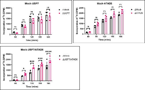 Figure 7. PAF15 dissociation negatively regulates aberrant increase of DNA methylation. Sperm chromatin and radiolabeled S-(methyl-3H)-adenosyl-L-methionine were added to either Mock- and USP7-, ATAD5-, or USP7/ATAD5 co-depleted extracts. Purified DNA samples were analyzed to determine the efficiency of DNA methylation. Data are presented as mean ± SEM from three biological replicates. Multiple comparisons were performed by two-way repeated measure ANOVA (RM ANOVA) followed by Sidak’s multiple comparison test. ns; not significant, ∗p<0.05, ∗∗∗p<0.001, and ∗∗∗∗p<0.0001. Source data are provided as Figure 7—source data 1. |