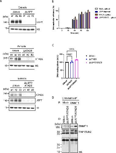 Figure 7—figure supplement 1. DNA replication and methylation analysis in USP7 or ATAD5-depleted extracts.(A) Mock-, USP7-, ATAD5-, or USP7/ATAD5 co-depleted extracts used in Figure 7 were analyzed by immunoblotting using the antibodies indicated. (B) Sperm chromatin and radiolabeled (α-32P) dCTP were added to Mock-, USP7-, ATAD5-, or USP7/ATAD5 co-depleted extracts. Purified DNA samples were analyzed to determine the efficiency of DNA replication. Data are presented as mean ± SEM from three biological replicates. (C) Sperm chromatin and radiolabeled S-(methyl-3H)-adenosyl-L-methionine were added to either Mock-, ATAD5-, or USP7/ATAD5 co-depleted extracts. Purified DNA samples were analyzed to determine the efficiency of DNA methylation. Data are presented as mean ± SEM from three biological replicates. Multiple comparisons were performed by two-way repeated measure ANOVA (RM ANOVA) followed by Sidak’s multiple comparison test. DNA methylation (A.U) was calculated relative to the value of mock-depleted control reactions. (D) Sperm chromatin was added to Mock- or USP7/ATAD5-depleted extracts. Replicating chromatin was isolated and digested by micrococcal nuclease (MNase). Immunoprecipitation was performed by DNMT1 antibodies-bound beads, and the samples were analyzed by immunoblotting using the antibodies indicated. Source data are provided as Figure 7—figure supplement 1—source data 1. Figure 7—figure supplement 1—source data 1. Figure 7—figure supplement 1 Original blots, DNA replication, and methylation data. |