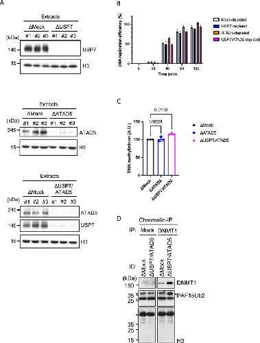 Figure 7-figure supplement 1. DNA replication and methylation analysis in USP7 or ATAD5-depleted extracts. (A) Mock-, USP7-, ATAD5-, or USP7/ATAD5 co-depleted extracts used in Figure 7 were analyzed by immunoblotting using the antibodies indicated. (B) Sperm chromatin and radiolabeled (α-32P) dCTP were added to Mock-, USP7-, ATAD5-, or USP7/ATAD5 co-depleted extracts. Purified DNA samples were analyzed to determine the efficiency of DNA replication. Data are presented as mean ± SEM from three biological replicates. (C) Sperm chromatin and radiolabeled S-(methyl-3H)-adenosyl-L-methionine were added to either Mock-, ATAD5-, or USP7/ATAD5 co-depleted extracts. Purified DNA samples were analyzed to determine the efficiency of DNA methylation. Data are presented as mean ± SEM from three biological replicates. Multiple comparisons were performed by two-way repeated measure ANOVA (RM ANOVA) followed by Sidak’s multiple comparison test. DNA methylation (A.U) was calculated relative to the value of mock-depleted control reactions. (D) Sperm chromatin was added to Mock- or USP7/ATAD5-depleted extracts. Replicating chromatin was isolated and digested by micrococcal nuclease (MNase). Immunoprecipitation was performed by DNMT1 antibodies-bound beads, and the samples were analyzed by immunoblotting using the antibodies indicated. Source data are provided as Figure 7—figure supplement 1—source data 1. |