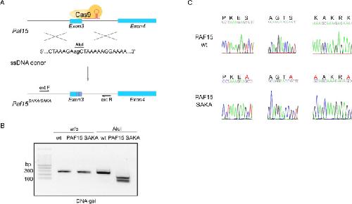 Figure 8-figure supplement 1. Generation and characterization of mouse embryonic stem cell (mESC) lines carrying the SAKA mutants by genome editing. (A) Schematic representation of the CRISPR/Cas9 gene editing strategy. The restriction enzyme recognition site for restriction fragment length polymorphism (RFLP) screening is shown. (B) Genotyping using RFLP analysis of PAF15 SAKA mutant line and digestion by the AluI enzyme. (C) DNA sequencing traces confirming the successful mutations of the SAKA in Paf15. |