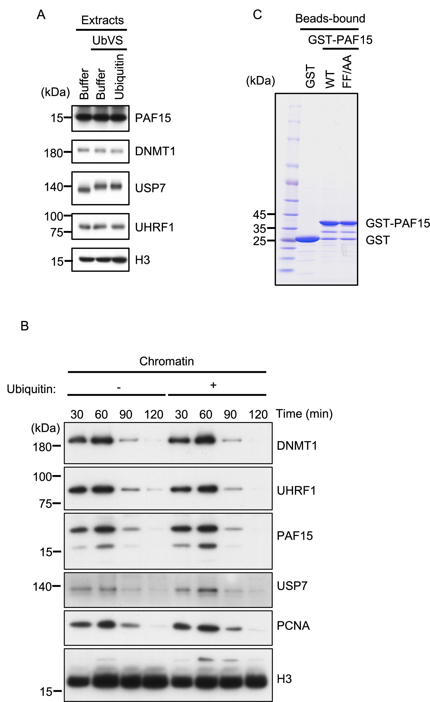 Figure 1-figure supplement 1. USP7 was identified as a PAF15 binding protein. (A) Interphase egg extracts supplemented with UbVS or UbVS+Ub used in Figure 1A were analyzed by immunoblotting using the antibodies indicated. (B) Purified GST or GST-rPAF15 mutants used in Figure 1D were stained using CBB. (C) Sperm chromatin was added to interphase egg extracts supplemented with either buffer (−) and 58 µM ubiquitin (+). Samples were analyzed by immunoblotting using the antibodies indicated. Source data are provided as Figure 1—figure supplement 1—source data 1. |