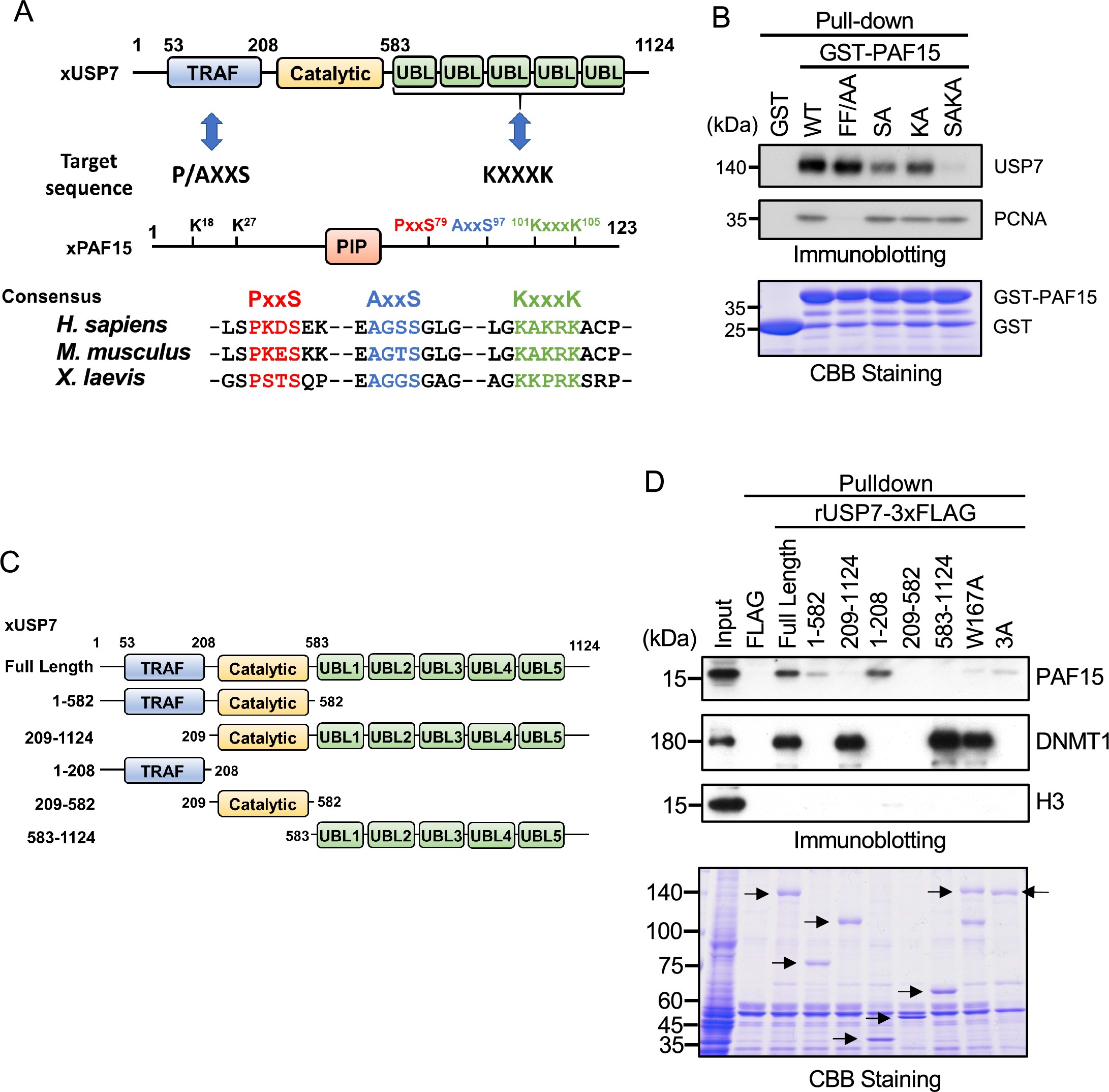 Figure 2. PAF15 associates with the TRAF and UBL1-2 domains of USP7. (A) Schematic illustration of PAF15-USP7 binding experiment. USP7 recognizes P/A/ExxS or KxxxK motifs in its substrates via TRAF or ubiquitin-like (UBL) domains, respectively. PAF15 has three motifs, and alanine mutations were introduced at S79, S97, K101, and K105. (B) GST pull-down from the interphase egg extracts using GST-PAF15, P/AxxS mutant (S79A/S97A; SA), KxxxK mutant (K101A/K105A; KA), and triple mutant (SAKA). The samples were analyzed by immunoblotting using the antibodies indicated. Purified GST or GST-PAF15 mutants used in pull-down assay were stained using CBB. (C) Schematic illustration of rUSP7 truncation mutants employed in (D). (D) FLAG pull-down from interphase egg extracts using rUSP7-3xFLAG mutants presented in (C), W167A and 3 A point mutants. USP7 3 A: D780A/E781A/D786A. The samples were analyzed by immunoblotting using the antibodies indicated. Samples were also stained by CBB. Arrowheads indicate rUSP7 truncation mutants and point mutants. Source data are provided as Figure 2—source data 1. |