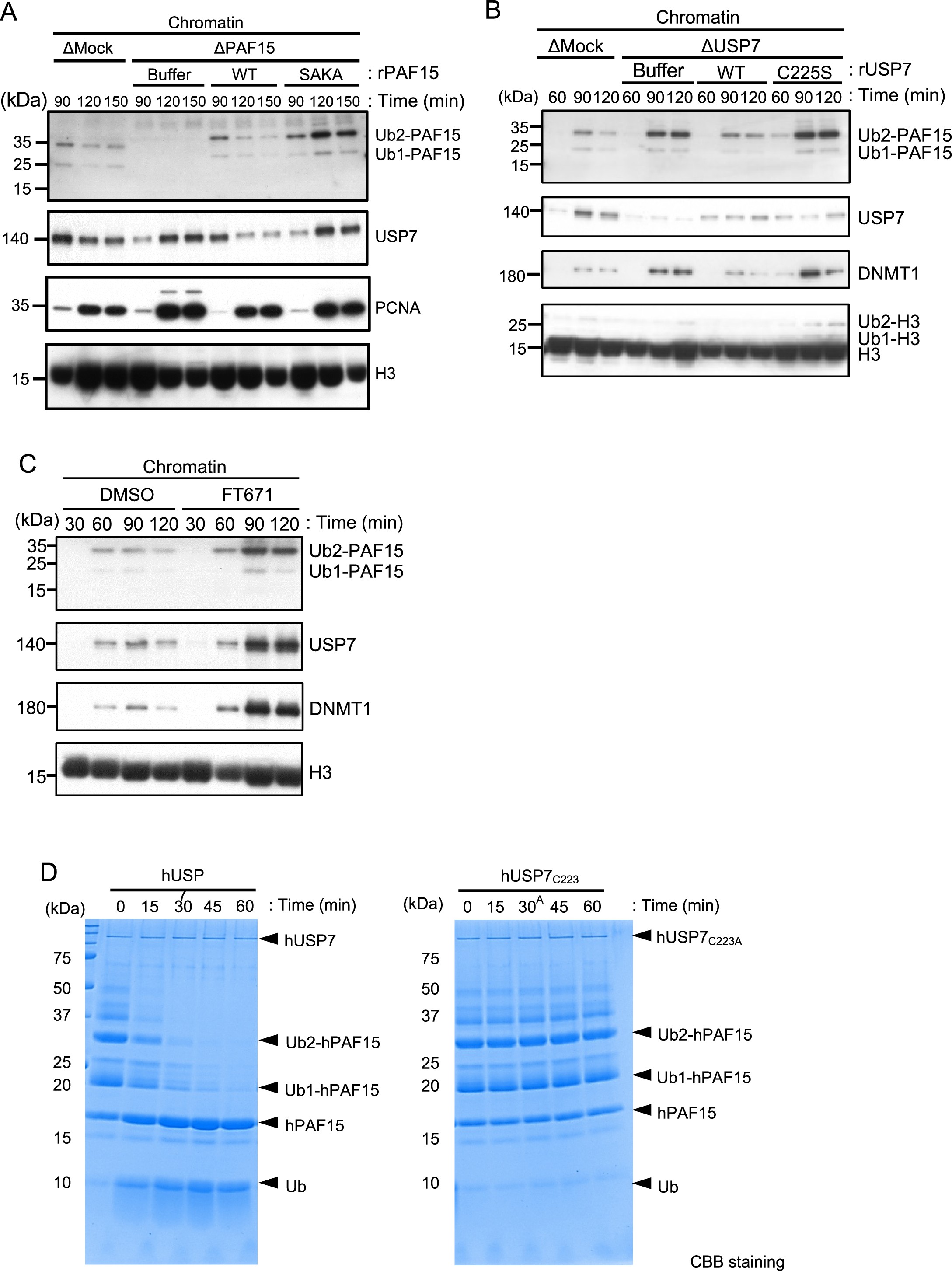 Figure 3. USP7 promotes PAF15 dissociation from chromatin. (A) Sperm chromatin was added to Mock- or PAF15-depleted interphase extracts supplemented with either buffer (+Buffer), wild-type rPAF15-3xFLAG (+WT) or rPAF15 SAKA-3xFLAG (+SAKA). Chromatin fractions were isolated, and the samples were analyzed by immunoblotting using the antibodies indicated. (B) Sperm chromatin was added to Mock- or USP7-depleted interphase extracts supplemented with either buffer (+Buffer), wild-type rUSP7-3xFLAG (+WT) or catalytic mutant rUSP7 C225S-3xFLAG (+C225 S). Chromatin fractions were isolated, and the samples were analyzed by immunoblotting using the antibodies indicated. (C) Sperm chromatin was added to interphase extracts supplemented with either dimethyl sulfoxide (DMSO) (+DMSO) or FT671 (+FT671). Chromatin fractions were isolated, and the samples were analyzed by immunoblotting using the antibodies indicated. (D) Ubiquitylated hPAF15 was incubated with recombinant hUSP7 WT (left) or C223A catalytic mutant (right) at indicated times. The reaction products were analyzed by SDS-PAGE with CBB staining. Source data are provided as Figure 3—source data 1. |