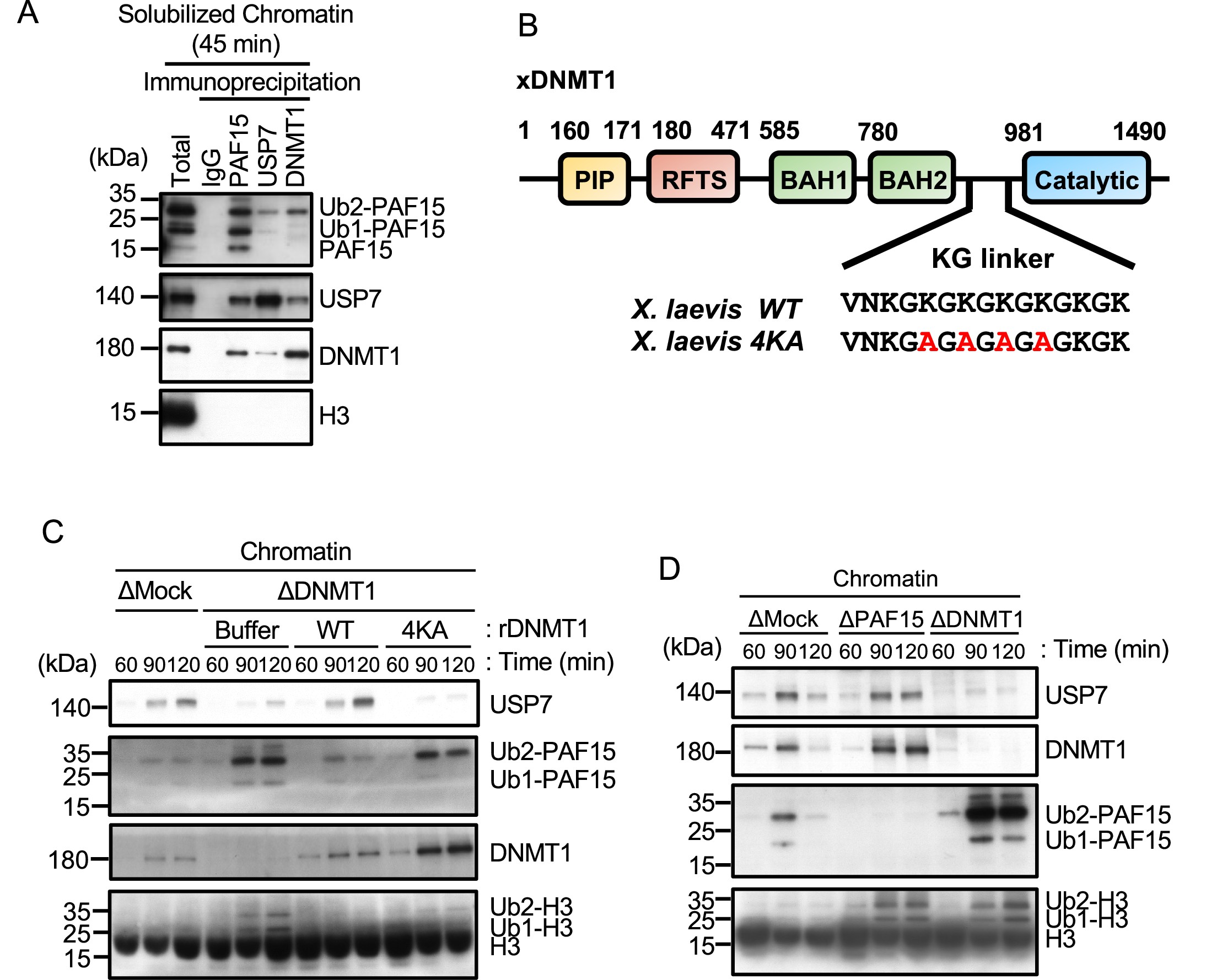 Figure 4. USP7 is recruited to chromatin through the interaction with DNMT1 for PAF15 deubiquitylation. (A) Sperm chromatin was added to interphase extracts. Replicating chromatin was digested by micrococcal nuclease (MNase). Immunoprecipitation was performed by PAF15, USP7, and DNMT1 antibodies from the solubilized chromatin fraction, and the samples were analyzed by immunoblotting using the antibodies indicated. (B) Illustration of DNMT1 domain structure. The KG linker located between the bromo-adjacent homology (BAH) domain and catalytic domain contributes to interaction with USP7. rDNMT1 4KA mutant, using in (C), was introduced mutation at four lysines to alanine in the KG linker. (C) Sperm chromatin was added to Mock- or DNMT1-depleted interphase extracts supplemented with either buffer (+Buffer), wild-type rDNMT1-3xFLAG (+WT), or rDNMT1 4KA-3xFLAG (+4 KA). Chromatin fractions were isolated, and the samples were analyzed by immunoblotting using the antibodies indicated. (D) Sperm chromatin was added to Mock-, PAF15-, and DNMT1-depleted extracts. Chromatin fractions were isolated, and the samples were analyzed by immunoblotting using the antibodies indicated. Source data are provided as Figure 4—source data 1. |