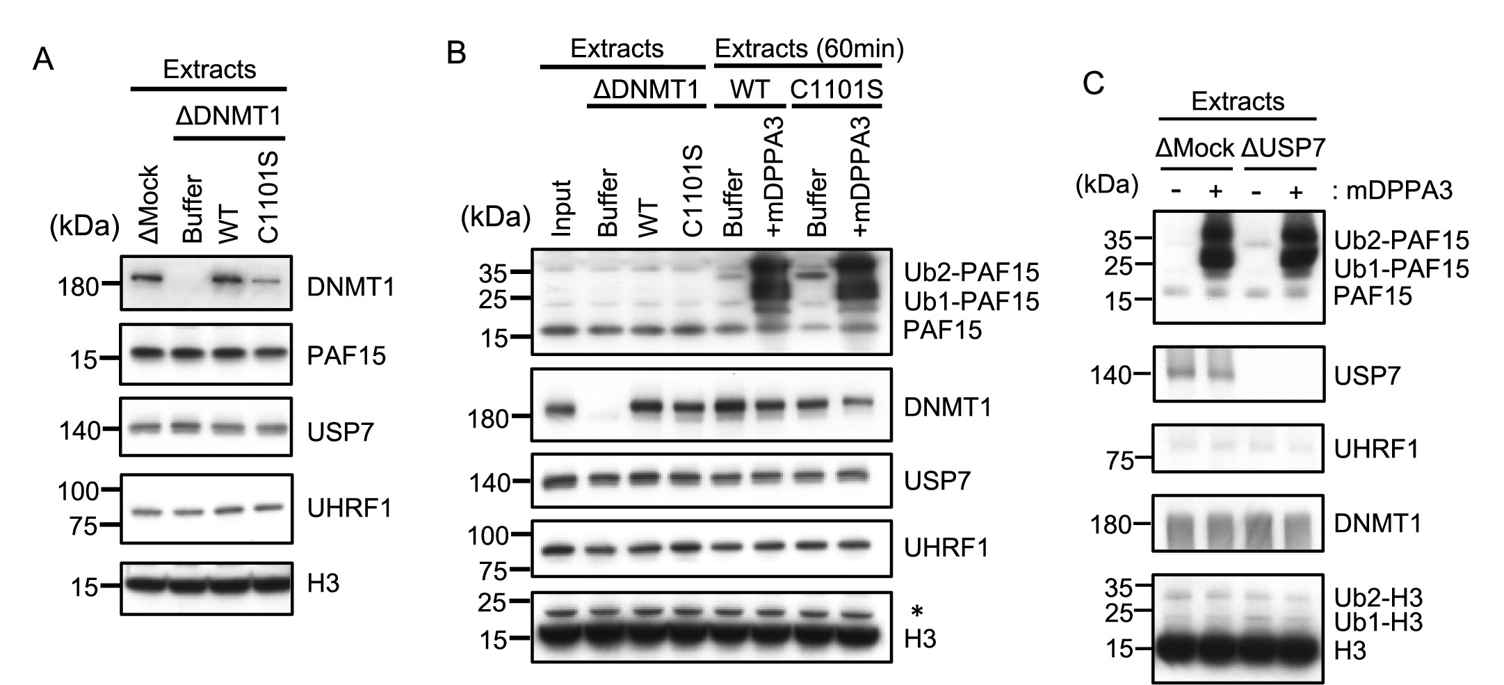 Figure 5—figure supplement 1. Unloading of PAF15 requires DNMT1-dependent DNA methylation.(A) rDNMT1 WT-3xFLAG or C1101S-3xFLAG were added to DNMT1-depleted extracts. The extracts used in Figure 5A were analyzed by immunoblotting using the antibodies indicated. (B) rDNMT1 WT-3xFLAG or C1101S-3xFLAG were added to DNMT1-depleted extracts used in Figure 5D. After 60 min, these extracts were supplemented with GST-mDPPA3. The extracts were analyzed by immunoblotting using the antibodies indicated. The asterisk indicates a non-specific band. (C) Replicating Mock- or USP7-depleted extracts at 90 min were supplemented with either buffer (−) or GST-mDPPA3 (+). The extracts were used in Figure 5E and analyzed by immunoblotting using the antibodies indicated. Source data are provided as Figure 5—figure supplement 1—source data 1. Figure 5—figure supplement 1—source data 1. Figure 5—figure supplement 1 Original blots. |