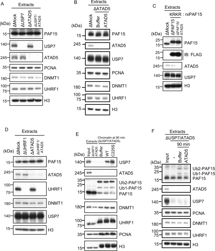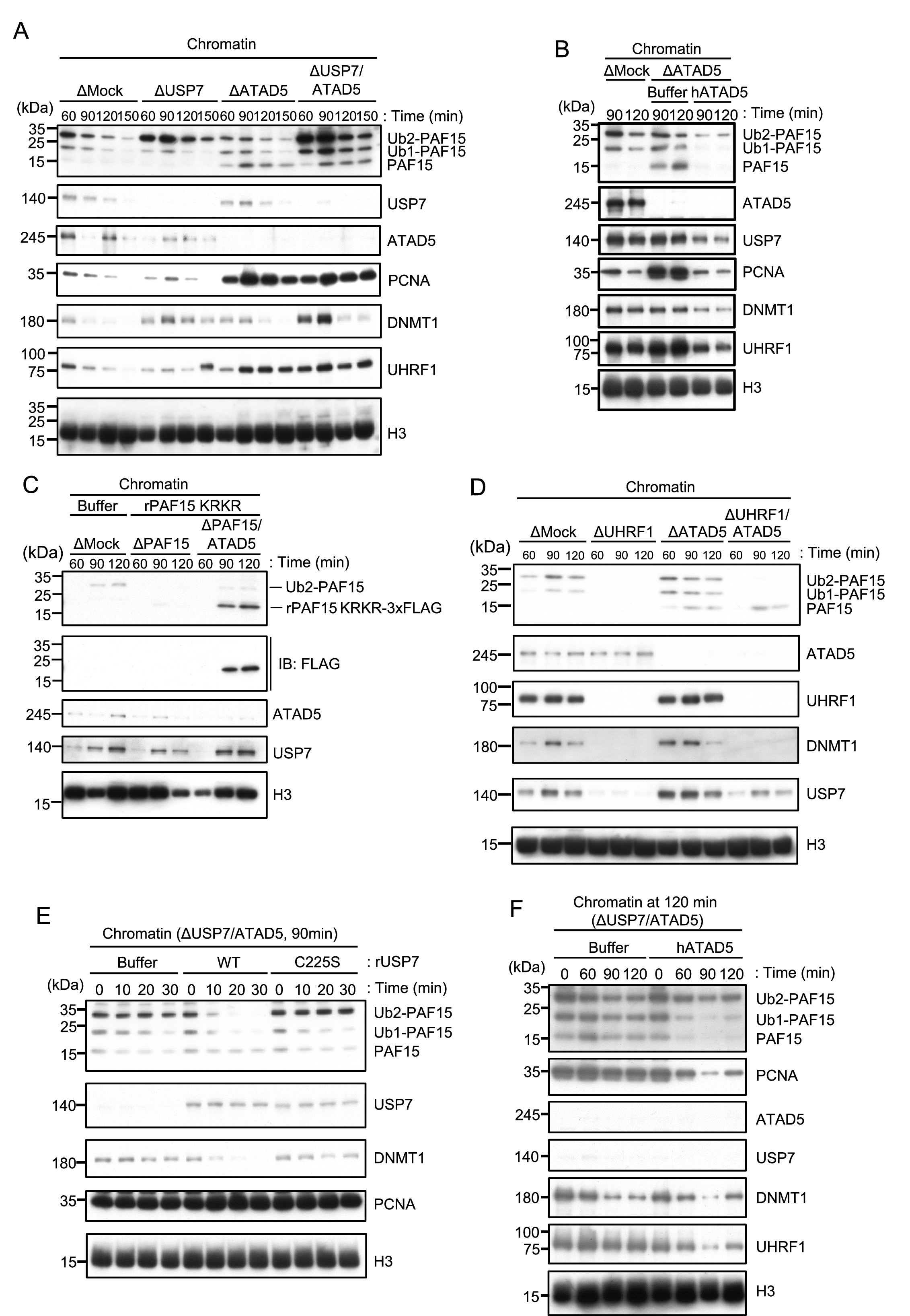Figure 6. ATAD5 unloads PAF15Ub0 from chromatin. (A) Sperm chromatin was added to Mock-, USP7-, ATAD5-, and USP7/ATAD5-depleted interphase extracts and isolated at indicated time points. Chromatin bound proteins were analyzed by immunoblotting. (B) Sperm chromatin was added to Mock-, ATAD5-depleted interphase extracts supplemented with either buffer (+Buffer) or recombinant hATAD5-RFCs (+ATAD5). Chromatin fractions were isolated, and the samples were analyzed by immunoblotting using the antibodies indicated. (C) Recombinant PAF15 K18R/K27R-3xFLAG was supplemented to PAF15- and PAF15/ATAD5-depleted extracts, and chromatin fractions were isolated. Chromatin bound proteins were confirmed by immunoblotting. (D) Sperm chromatin was added to Mock-, UHRF1-, ATAD5-, and UHRF1/ATAD5-depleted extracts and isolated at indicated time point. Chromatin bound proteins were analyzed by immunoblotting. (E) Sperm chromatin was added to USP7/ATAD5-depleted extracts and isolated at 90 min. The chromatin was supplemented with either buffer (+Buffer), USP7 WT-3xFLAG (+WT), or USP7 C225S-3xFLAG (+C225 S) and re-isolated at indicated time points. Chromatin bound proteins were analyzed by immunoblotting. (F) Sperm chromatin was added to Mock- and USP7/ATAD5-depleted extracts. After replication at 90 min, the extracts were supplemented with either buffer (+Buffer) or recombinant hATAD5-RFCs (+ATAD5). Chromatin fractions were isolated, and the samples were analyzed by immunoblotting using the antibodies indicated. Source data are provided as Figure 6—source data 1. |