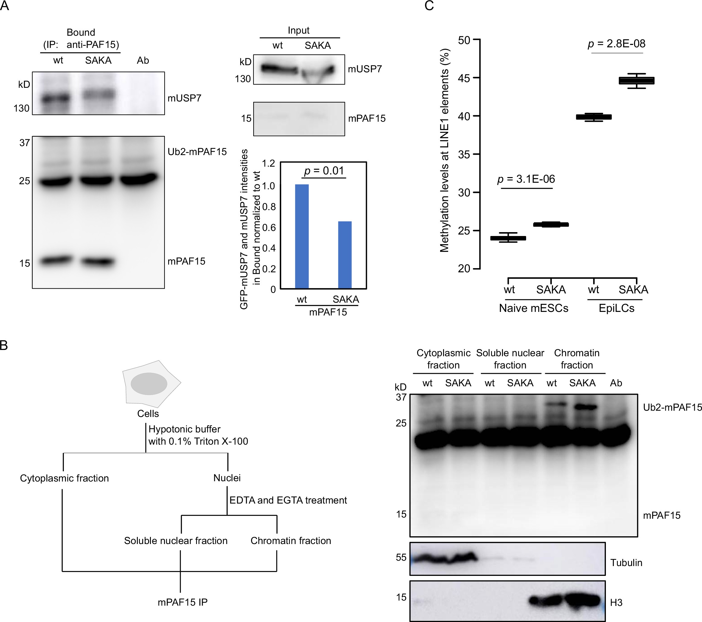 Figure 8. mUSP7 interacts with mPAF15 to assure a complete DNA methylation maintenance. (A) Immunoprecipitation (IP) of endogenous mPAF15 from whole cell lysates of wt and mPAF15 SAKA mouse embryonic stem cells (mESCs) using an anti-PAF15 antibody. Bound fractions were subjected to immunoblotting with anti-USP7 and PAF15 antibodies. The bar plot shows the quantifications of the relative GFP-mUSP7 and mUSP7 co-precipitated with mPAF15. The error bar stands for SD from three biological replicates. A paired t-test with two tails was done, and p value was indicated. (B) Scheme of the cell fractionation experiment described in Figure 7B (left). IP of endogenous mPAF15 from cytosolic, soluble nuclear, and chromatin fractions using an anti-PAF15 antibody. Bound fractions were subjected to immunoblotting with PAF15 antibody. Immunoblotting with anti-Tubulin and anti-H3 antibodies is used to indicate the cytosolic and chromatin fractions, respectively. (C) Boxplot shows the DNA methylation levels of LINE-1 elements in both wt and mPAF15 SAKA naïve and epiblast-like cells (EpiLCs). Center lines show the medians; box limits indicate the 25th and 75th percentiles as determined by R software; whiskers extend 1.5 times the interquartile range from the 25th and 75th percentiles; outliers are represented by dots. Data sets from four biological replicates were tested for significance with an unpaired t-test with one tail was performed, and p values are indicated. |