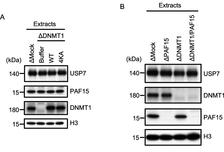 Figure 4-figure supplement 1. USP7 is recruited to chromatin through the interaction with DNMT1. (A) rDNMT1WT-3xFLAG or 4KA-3xFLAG were added to DNMT1-depleted extracts. The extracts used in Figure 4C were analyzed by immunoblotting using the antibodies indicated. (B) Mock-, PAF15-, DNMT1-, or PAF15/DNMT1 co-depleted extracts used in Figure 4D were analyzed by immunoblotting using the antibodies indicated. Source data are provided as Figure 4—figure supplement 1—source data 1. |