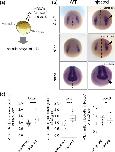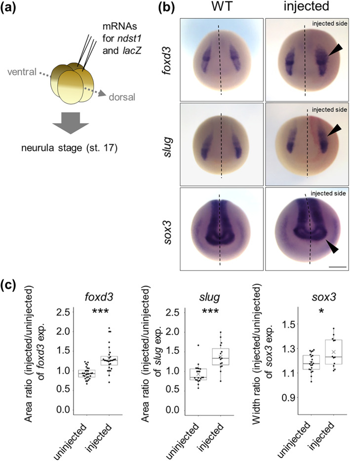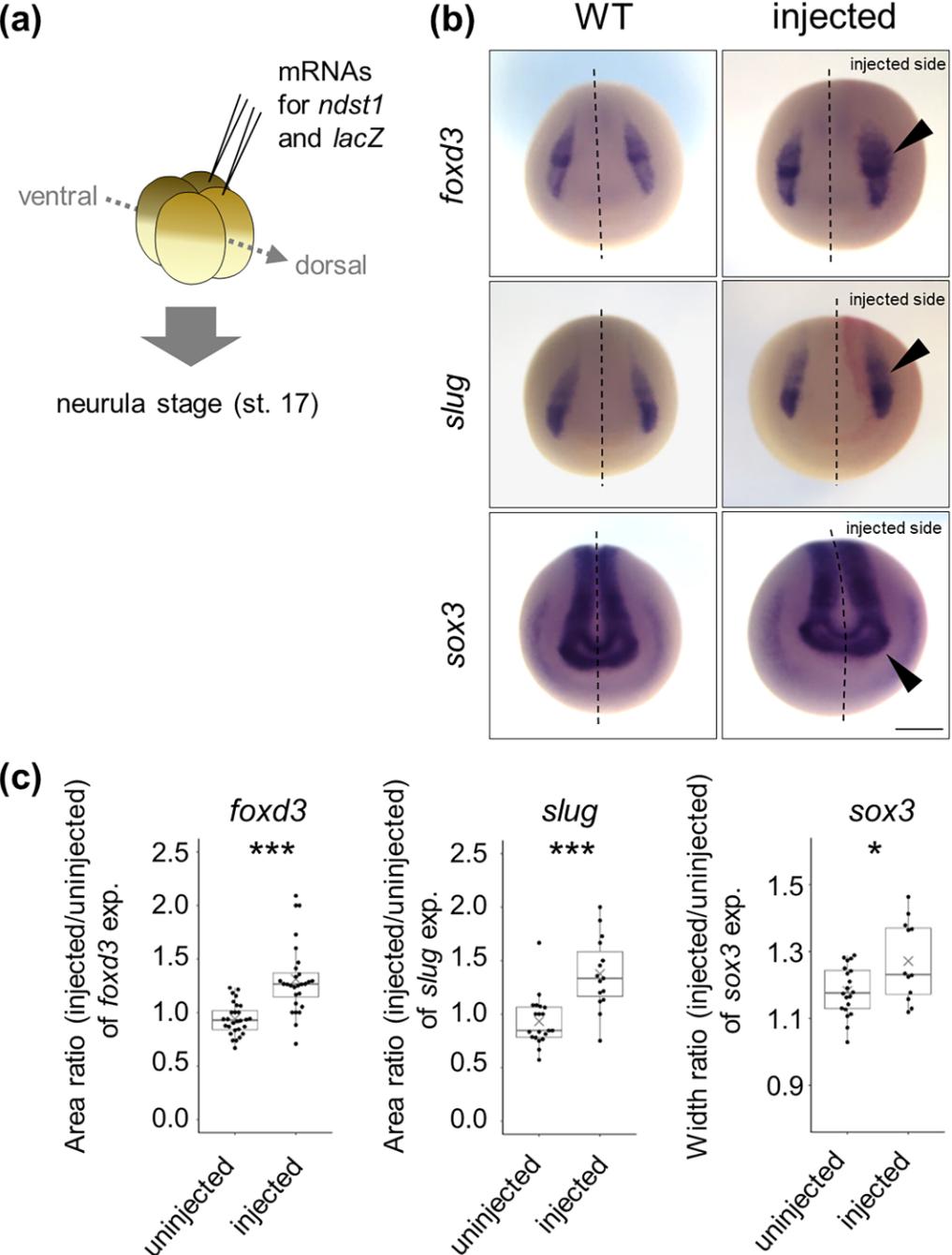Figure 2. Overexpression of ndst1 expands the neural crest region (a) Schematic view of the injection. 25 pg ndst1.L mRNA with a tracer, 100 pg lacZ mRNA, were injected into two blastomeres at the 4-cell stage (slightly lateral from the midline as indicated), and the specimens were fixed at the neurula stage (st. 17). The light brown cells are the dorsal blastomere. The dark ones are the ventralblastomere. (b and c) Expression pattern of foxd3, slug, and sox3 in ndst1-overexpressed embryos. lacZ injected cells (a tracer) are colored red (“injected side” in the figures). ndst1 overexpression expands the neuroectodermal-gene expressed region as quantified in (c). Arrowheads indicate the expanded region. Dashed line indicates the midline of the embryo. Differences in expression areas were quantified by their area or width from the midline for the injected and uninjected sides. Statistical significance was analyzed by Student's t-test (p = 1.1 × 10−6 [foxd3; n = 28 (uninjected) vs. 27 (injected)], 6.1 × 10−5 [slug; n = 20 (uninjected) vs. 15 (injected)], 0.014 [sox3; n = 20 (uninjected) vs. 12 (injected)]). *p < 0.05, ***p < 0.005. Scale bar = 500 μm.