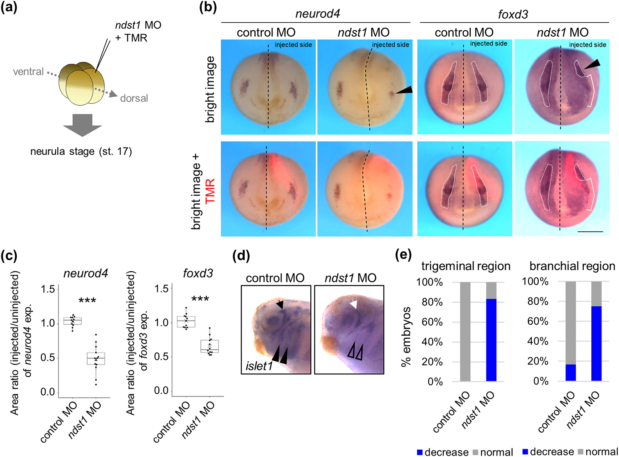 Figure 3. Knockdown of ndst1 reduces the anterior neural crest region. (a) Schematic view of the injection. 2.5 pmol of ndst1 morpholino antisense oligos with a tracer, tetramethylrhodamine (TMR), were injected into dorsal blastomere (dorsal and ventral blastomeres, slightly lateral from the midline as indicated), and specimens were fixed at the neurula stage (st. 17). (b and c) Expression pattern of foxd3 and neurod4. TMR injected cells are colored red (the right side in the figures). This morpholino injection reduced the expressed region of both genes (arrowhead) as quantified in (c). p = 1.8 × 10−8 (neurod4; n = 11 (control morpholino antisense oligonucleotide [MO]) vs. 13 (ndst1 MO)), 1.9 × 10−7 (foxd3; n = 11 (control MO) vs. 12 (ndst1 MO)) (Student's t-test). (d and e) islet1 expression pattern at the tailbud stage (st. 32) in the morphants. ndst1 knockdown reduces islet1 expression in the trigeminal region (arrow), and the branchial region (arrowheads) as quantified in (e) (Fisher's exact test, p = 6.3 × 10−5 (trigeminal ganglia), 1.2 × 10−2 (cranial ganglia); n = 12 each). ***p < 0.005. Scale bar = 500 μm.