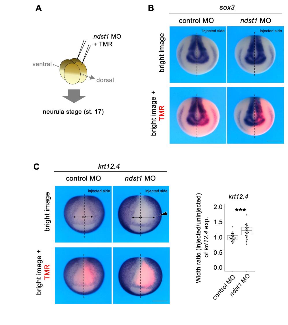 Figure S2.Knockdown of ndst1 reduced the epidermal region, but not the neural plate region. (A) Schematic view of the injection. 2.5 pmol of ndst1 morpholino antisense oligos with a tracer, TMR, were injected into the dorsal blastomere, and specimens were fixed at the neurula stage (st. 17). (B–C) Expression pattern of sox3 and krt12.4. TMR injected cells are colored red (the right side in each figure). This morpholino injection reduced krt12.4-expressed region (arrowhead; n = 25 [control MO], n = 26 [ndst1 MO]), but not sox3-expressed region (n = 29/30 [control MO], n = 28/30 [ndst1 MO]). Differences in krt12.4-expressed region were quantified by the width from the midline to the place where the expression is visible, as shown by double-headed arrows in the figures. ***p = 4.25 × 10−5 (Student's t-test). Scale bar = 500 μm.