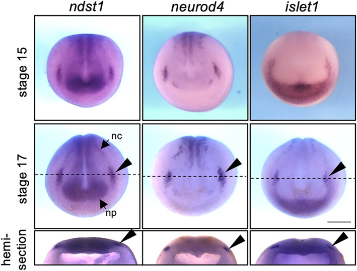 FIGURE 1. Expression pattern of ndst1, neurod4, and islet1 in Xenopus neurula. Spatial expression pattern of ndst1, neurod4, and islet1 was visualized by in situ hybridization at the neurula stage (stages 15, 17; anterior view, dorsal to the top). The specimen was cut with a razor at the dashed line (hemi‐section). All three genes were expressed at the lateral sensorial layer of neuroectoderm (arrowhead). Scale bar = 500 μm. nc, neural crest; np, neural plate.