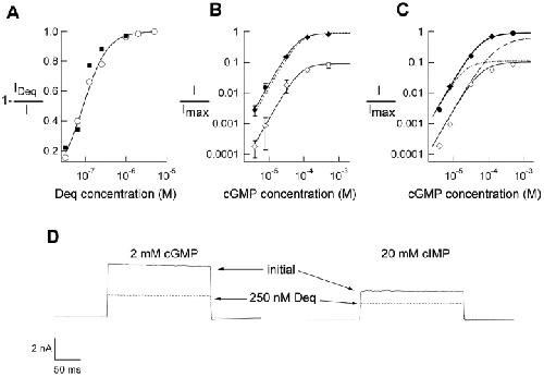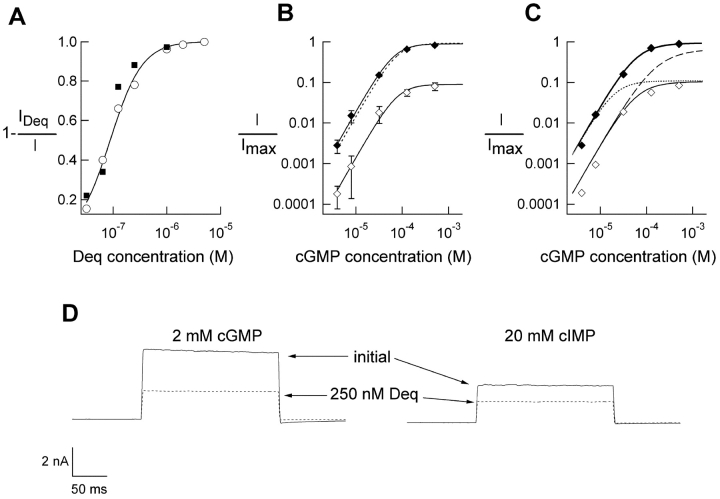 Figure 5. . Block by dequalinium is state independent. (A) Dose-response relations for dequalinium block in the presence of saturating cGMP (2 mM cGMP, filled squares) and in the presence of subsaturating cGMP (32 μM cGMP, open circles). Data are presented as fraction of block for comparison purposes. The smooth line is a fit with Eq. 1, K1/2 = 189 nM. (B) Dose-response for cGMP in the absence (filled diamonds) and presence of 400 nM dequalinium (open diamonds). Error bars represent SEM, n = 4 patches. The smooth lines represent fits to the Eq.1 with K1/2 = 80 μM in the presence of dequalinium K1/2 = 90 μM in the absence of dequalinium. Dotted line represents normalization of the data obtained in the presence of 400 nM dequalinium to the data obtained in the absence of dequalinium, K1/2 = 80 μM. (C) Predicted fits with the models shown in Schemes 1–4. Filled and hollow diamonds are from the same data in B. The dashed line represents a fit with Scheme III (pure open channel block), the dotted line represents block only in the closed state (Scheme II, pure closed channel block) and the thin line represents block occurring equally during the closed and open states of the channel with a KD = 50 nM for both of the conformational states (Scheme IV). The parameter values for these fits were L = 19 and K = 3800 M−1 (in all cases). (D) Block of currents by 250 nM dequalinium in the presence of 2 mM cGMP (left) and in the presence of 20 mM cIMP, a partial agonist of these channels (right). In both cases block was of ∼48%.