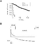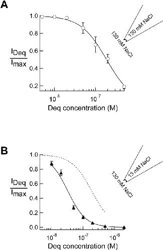 Figure 7. . Interaction of dequalinium with the permeant ion. (A) Dose-response relation for block by dequalinium in 130 mM NaCl (circles) with K1/2 = 189 nM and (B) triangles represent data obtained with 13 mM NaCl with K1/2 = 39 nM (knock-off experiment) and the dotted-line represents data shown in A (see materials and methods). Error bars represent SEM, n = 5.