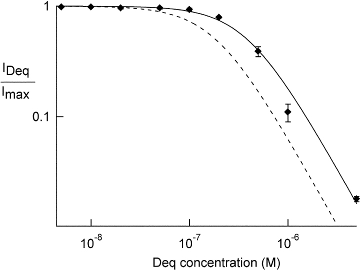 Figure 2. . Dequalinium blocks heteromeric CNGA1+CNGB1 channels. Dose-response relation for block of heteromeric channels by dequalinium. A 1:4 ratio of CNGA1:CNGB1 RNA was injected in oocytes. The dotted curve was taken from the CNGA1 homomeric data shown in Fig. 1 C. Data from heteromeric channels (diamonds) were fit with the Hill equation with the following parameters: K1/2 = 385 nM, Hill coefficient = 1.5.