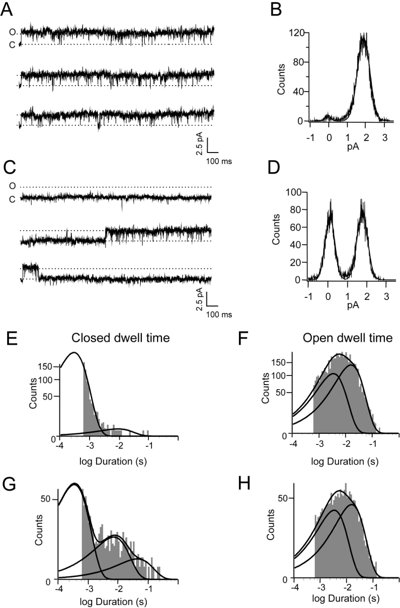 Figure 8. . Single-channel recordings. (A) Single-channel current traces in response to depolarizing voltage pulses to 60 mV in the presence of 2 mM cGMP. Channel open probability = 0.92. Open (O) and closed (C) levels are indicated in the figure. (B) All-points amplitude histogram that corresponds to a current amplitude of 1.9 pA. (C) Current traces from the same channel in A recorded in the presence of 5 nM dequalinium at the same potential. (D) The amplitude histogram shows that the single-channel conductance remains unchanged. (E) The closed distribution for cGMP alone can be fit with sum of two exponentials of time constants 0.34 and 8.4 ms. (F) Open time constant for cGMP alone. The distribution can be fitted with sums of two exponentials with time constants 3.4 and 16 ms. (G) Closed time distribution in the presence of 5 nm dequalinium. In the presence of dequalinium the same time constants are present (0.35 and 7.2 ms), but a third (43.7 ms) appears that corresponds to the blocked state. (H) Open time distribution in the presence of 5 nM dequalinium. The distribution can be fitted with sums to two exponentials (3.4 and 15.6 ms). Similar results were obtained from three other single-channel patches.