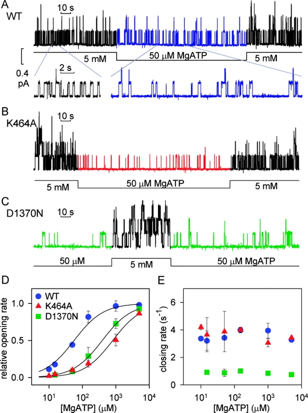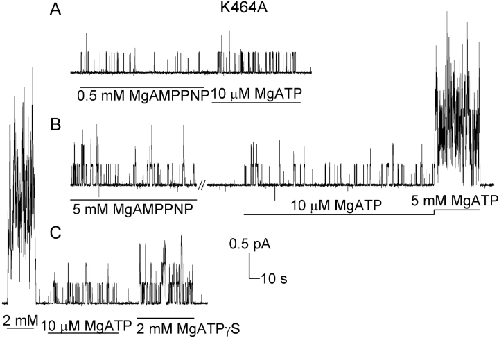 CFTR, the product of the gene mutated in cystic fibrosis, is an ATPase that functions as a Cl(-) channel in which bursts of openings separate relatively long interburst closed times (tauib). Channel gating is controlled by phosphorylation and MgATP, but the underlying molecular mechanisms remain controversial. To investigate them, we expressed CFTR channels in Xenopus oocytes and examined, in excised patches, how gating kinetics of phosphorylated channels were affected by changes in [MgATP], by alterations in the chemical structure of the activating nucleotide, and by mutations expected to impair nucleotide hydrolysis and/or diminish nucleotide binding affinity. The rate of opening to a burst (1/tauib) was a saturable function of [MgATP], but apparent affinity was reduced by mutations in either of CFTR's nucleotide binding domains (NBDs): K464A in NBD1, and K1250A or D1370N in NBD2. Burst duration of neither wild-type nor mutant channels was much influenced by [MgATP]. Poorly hydrolyzable nucleotide analogs, MgAMPPNP, MgAMPPCP, and MgATPgammaS, could open CFTR channels, but only to a maximal rate of opening approximately 20-fold lower than attained by MgATP acting on the same channels. NBD2 catalytic site mutations K1250A, D1370N, and E1371S were found to prolong open bursts. Corresponding NBD1 mutations did not affect timing of burst termination in normal, hydrolytic conditions. However, when hydrolysis at NBD2 was impaired, the NBD1 mutation K464A shortened the prolonged open bursts. In light of recent biochemical and structural data, the results suggest that: nucleotide binding to both NBDs precedes channel opening; at saturating nucleotide concentrations the rate of opening to a burst is influenced by the structure of the phosphate chain of the activating nucleotide; normal, rapid exit from bursts occurs after hydrolysis of the nucleotide at NBD2, without requiring a further nucleotide binding step; if hydrolysis at NBD2 is prevented, exit from bursts occurs through a slower pathway, the rate of which is modulated by the structure of the NBD1 catalytic site and its bound nucleotide. Based on these and other results, we propose a mechanism linking hydrolytic and gating cycles via ATP-driven dimerization of CFTR's NBDs.
