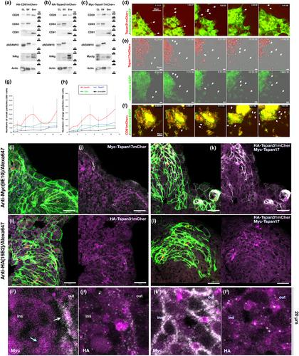 Figure 4. Changing properties of EVs by overexpressing several Tspans. (a) HA-hCD81mCher+ overexpression in MX-1 breast cancer cells. Exogenous CD81 was detected in EVs and Exo. (b) HA-rTspan31mCher+ overexpression. Tspan31 was seen in both EVs and Exo, and enriched in Exo. (c) Myc-rTspan17mCher+ overexpression. Tspan17 was detected in Exo. (d–f) Time-lapse imaging of CNCs with overexpression of mCherry-labeled Tspans. (d) Tspan31mCher+ expressing CNCs. The small EVs were seen from early captures (~1 h). Many EVs were observed to be secreted from the budding of membrane. (e) Tspan17mCher+ red fluorescence (above) and membrane EGFP fluorescence (below). The large EVs were seen from 6 h after the start of capture. Arrows indicate that large fragments of the cells stayed longer than those of other Tspans. (f) CD81mCher+ CNCs. The overexpressing CNCs moved as a cohort. The single cells around the cluster were also connected to each other with a long tail. (g) Quantification of small EVs (<1 μm diameter). (h) Quantification of large EVs (1–10 μm diameter). (i–i′) Confocal images of sections immunostained with anti-Myc or anti-HA. (i) Transverse section of the craniofacial region of a Myc-rTspan17mCher+ RNA injected embryo stained with mouse monoclonal anti-Myc and an Alexa647-labeled secondary antibody (gray). The sections were not permeabilized. (i′) There were Tspan17mCher+ (red) cells without gray dots. Myc staining was observed on the skin side. (j) Section of an HA-rTspan31mCher+ embryo stained with anti-HA. (j′) Gray dots overlapped with Tspan31mCher+ cells. (k, l) Section of an HA-rTspan31mCher+ with Myc-Tspan17 (non-fluorescent) injected embryo. (k, k′) Anti-Myc gray dots appeared more spread out than in (i′) along Tspan31mCher+. (l, l′) Anti-HA staining. Gray dots looked similar to (j′). ins, inside; out, outside. |