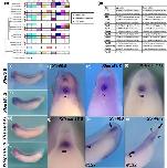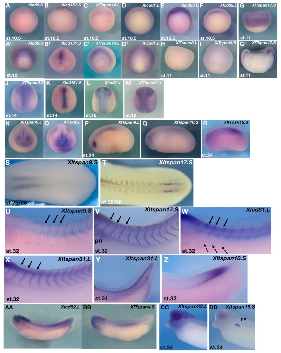 Figure S1. Early expression and expression in somites. (A, A′) Xlcd9.S expression. Faint expression was seen in the dorsal region at st.10.5. No expression was observed in the posterior end of the axial mesoderm. (B, B′) Xlcd151.S expression. The early gastrula expression domain was not clear. Axial expression was highest at st.12. (C, C′) XlTspan14.L expression was seen in the neural ectoderm. (D, D′) Xlcd81.L expression. Expression was observed in invaginating edges at st.10.5. Axial expression was absent at st.12. (E) Xlcd63 expression was observed in the entire ectoderm. (F) Xlcd82.L expression was seen at the dorsal lip. (G) XlTspan17.S expression was seen in the early neural plate. (G′) The image in (G) was cut in half along the midline. (H, I) XlTspan9.L and XlTspan4.S were negative at st.11. (J) XlTspan4.S expression. Expression was broadly observed in the dorsal ectoderm. (K) Xlcd151.S expression was seen in the notochord. (L) Xlcd81.L expression was absent from the axial mesoderm and present in the neuroectoderm at st.16. (m) XlTspan31.L expression was seen in the cranial neural crest and the neural plate. (N) XlTspan9.L expression was seen in the distal tip of the eye field. (O) Xlcd82.L expression was seen in the eye and forebrain. (P) XlTspan9.L expression. A similar embryo as in Figure 2a. (Q) XlTspan16.S expression at st.24. Notochord expression was not seen at this stage. (R) XlTspan18.S expression. The expression in somites started and extended posteriorly from the position where somite expression of XlTspan9.L finished. (S) Dorsal view of an embryo similar to the one in (P). XlTspan9.L expression was missing from the midline. (T) High-bleached embryo with XlTspan17.S staining. Expression was observed in each somite and presegmented mesoderm. (U) XlTspan9.S expression was slightly shifted posteriorly. Expression was seen at the center of each segment. (V) XlTspan17.S was seen in every somite. Expression was also seen in the pronephric duct (pn). (W) Xlcd81.L expression. The arrows indicate the same position as the arrows in (V). The ventral halves of the expression area were missing. (X) XlTspan31.L was also seen in every somite. (Y) Even in later-stage embryos, expression was observed in every somite. (Z) XlTspan18.S expression remained in the posterior somites. (AA) Expression of Xlcd82.L in the whole tadpole. (BB) The XlTspan4.S expression pattern was almost the same as in a previous publication (Kashef et al., 2013). (CC) XlTspan33.L expression. Expression was observed in the retina. (DD) XlTspan16.S expression was seen in the forebrain and pronephore (pn). |