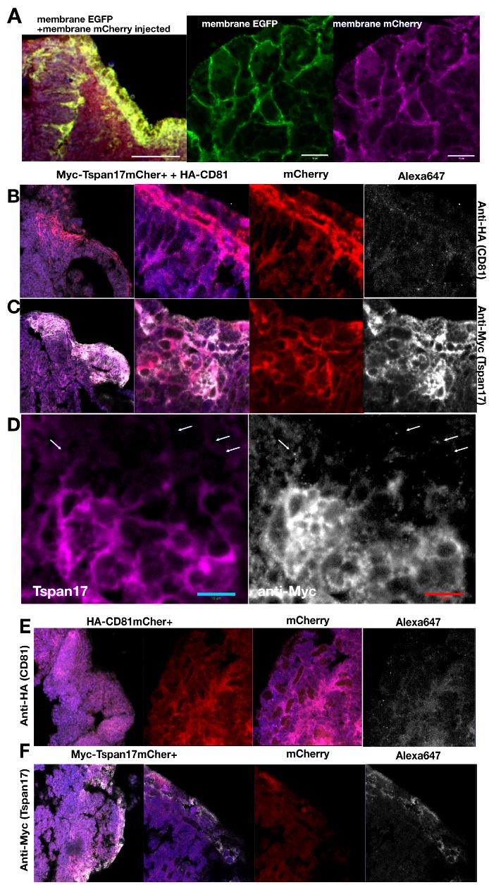 Figure S3. In vivo Tspan localization. (A) Co-injection of membrane EGFP and membrane mCherry mRNA. Cranial neural crest cells were seen underneath the skin. EGFP fluorescence (left) and mCherry fluorescence overlapped, even in small cell protrusions. (B) The immunofluorescence of the section from Myc-tagged Tspan17mCher+ with HA-tagged hCD81 RNA injected embryos. Anti-HA staining (CD81 distribution) was dispersed, and very weakly associated with Tspan17mCher+ fluorescence. (C) Anti-Myc staining was strongly associated with Tspan17mCher+ fluorescence. (D) High magnification images revealed that Myc-positive particles were spread over mCherry fluorescence as multiple tiny particles (arrows). (E) anti-HA staining of an HA-CD81mCher+ RNA injected embryo. HA staining and mCherry fluorescence overlapped. (F) Anti-Myc staining of Myc-Tspan17mCher+ RNA injected embryo. Myc staining and mCherry fluorescence overlapped; however, Myc-positive particles were often associated with the epidermis. |