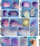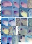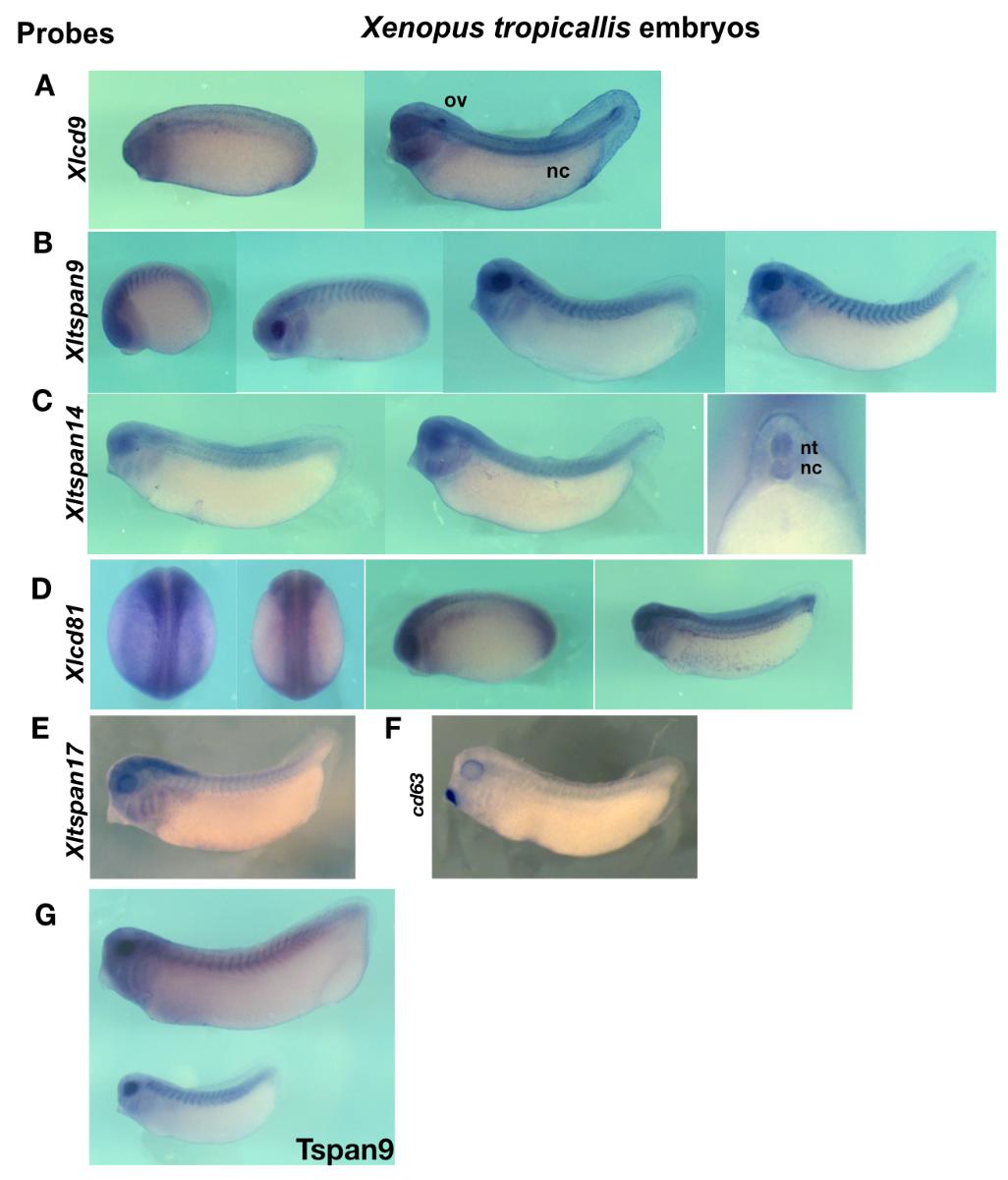 Figure S4. Cross-hybridization of Xenopus laevis probes to Xenopus tropicalis embryos. (A–F) Xenopus tropicalis embryos hybridized with X. laevis Tspan probes. (A) CD9 probe. Expression in the notochord was detected similar to that of Xlcd9. (B) Tspan9 expression. Eye-specific expression was conserved. Expression in somites seemed slightly wider in X. tropicalis. (C) Tspan14 expression. The expression pattern was similar; however, analysis of transverse slices showed that expression was observed in the neural tube (nt) and notochord (nc), and in X. laevis only notochord expression was observed (Figure 1i). (D) CD81 expression. Neurula expression was quite similar to that of Xlcd81. However, in the tailbud or tadpole stage, expression in the pronephric duct was strong, and expression in the ventral vein was observed in X. tropicalis. (E) Tspan17 expression at the tadpole stage was very similar to that in X. laevis. (F) CD63 expression at the tadpole stage was similar to that of Xlcd63 (Figure 3j). However, expression in melanocytes was weak. (G) X. laevis embryos and X. tropicalis embryos were hybridized in the same vial. Staining and bleaching were also done in the same vial. |