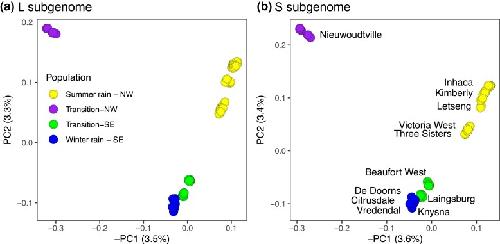 Fig. 3. Principal components analysis of RRGS data from X. laevis for the (a) L and (b) S subgenomes. For each analysis, the percentages of genotypic variation represented by the first and second principal components (PC1 and PC2, respectively) are indicated. Patterns of population structure are similar in each subgenome and samples cluster by rainfall zone (indicated with color in the left panel) and by locality (labeled in right panel).