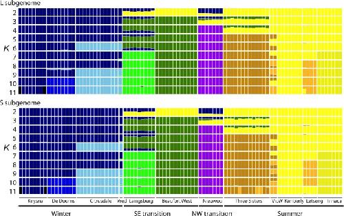 Fig. 4. Admixture plot using only the L subgenome (top) or only the S subgenome (bottom) for 2–11 ancestry components (K) labeled on the left side. The order of the samples is from left to right matches the order of samples in Supplementary Table 1.